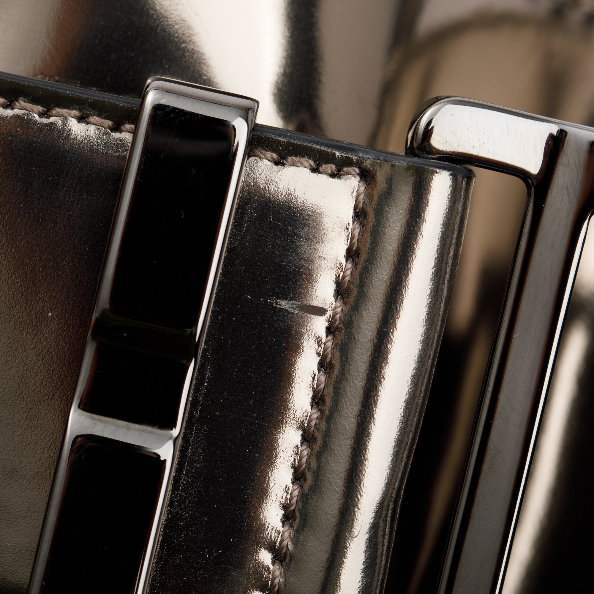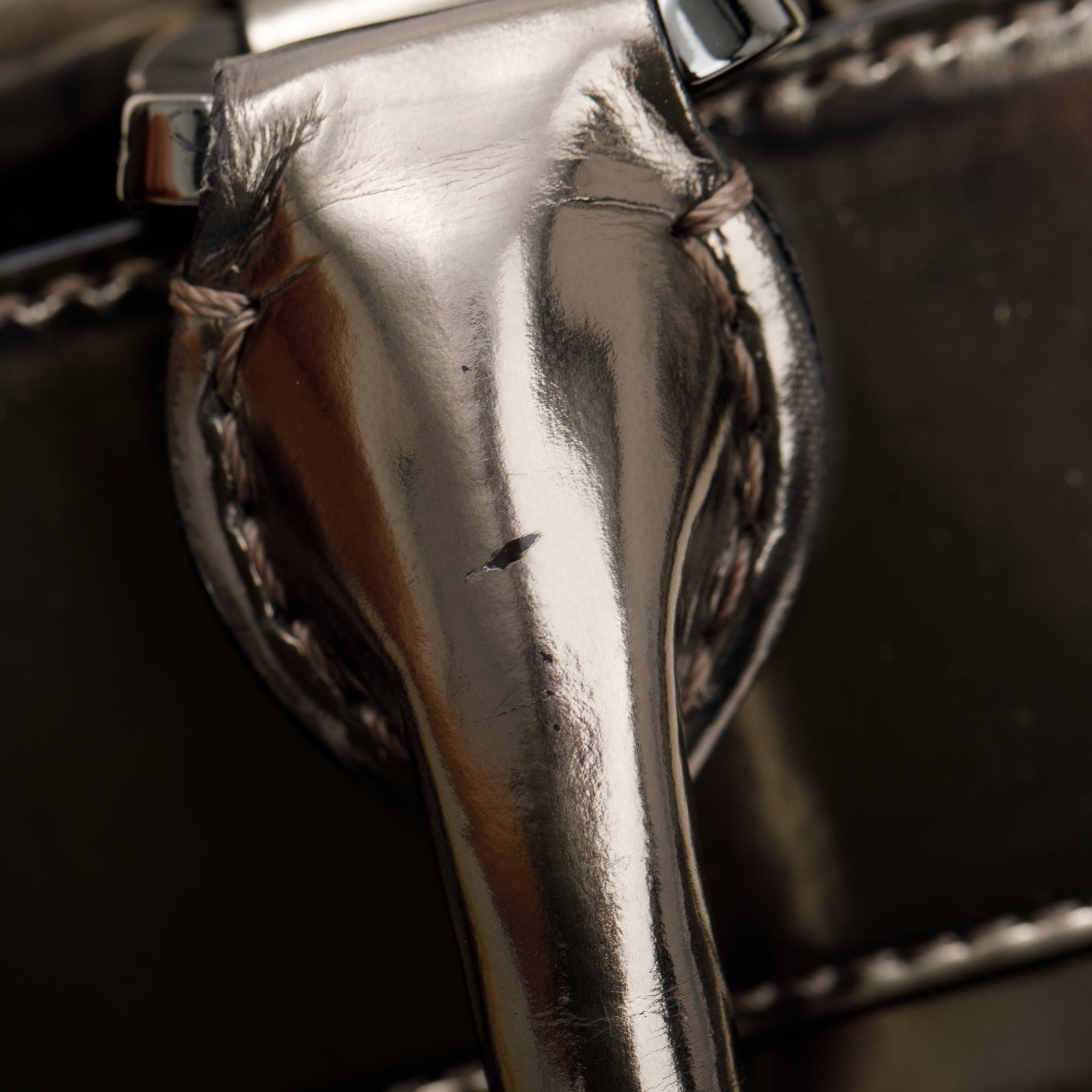 Condition: Very Good; slight scratches at exterior patent leather trim and shoulder straps; slight scratches at base; clean interior