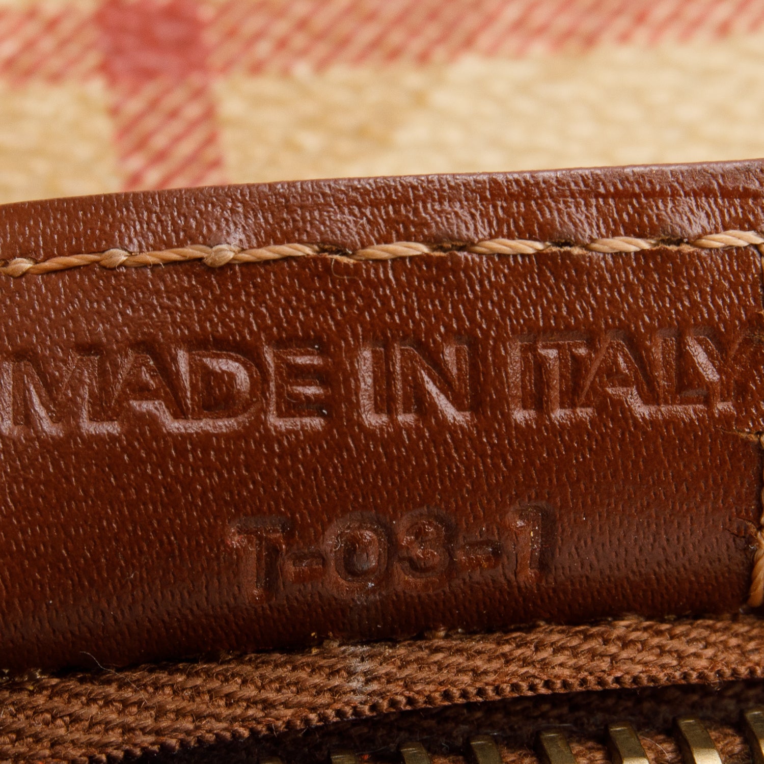 Condition: Good; slight tarnishing at hardware; light creasing and fraying at leather shoulder strap; slight marks at exterior canvas; clean interior