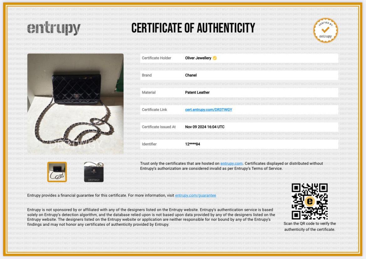 Condition: Very Good; light creasing at exterior patent leather; faint scratches at flap underside; clean interior