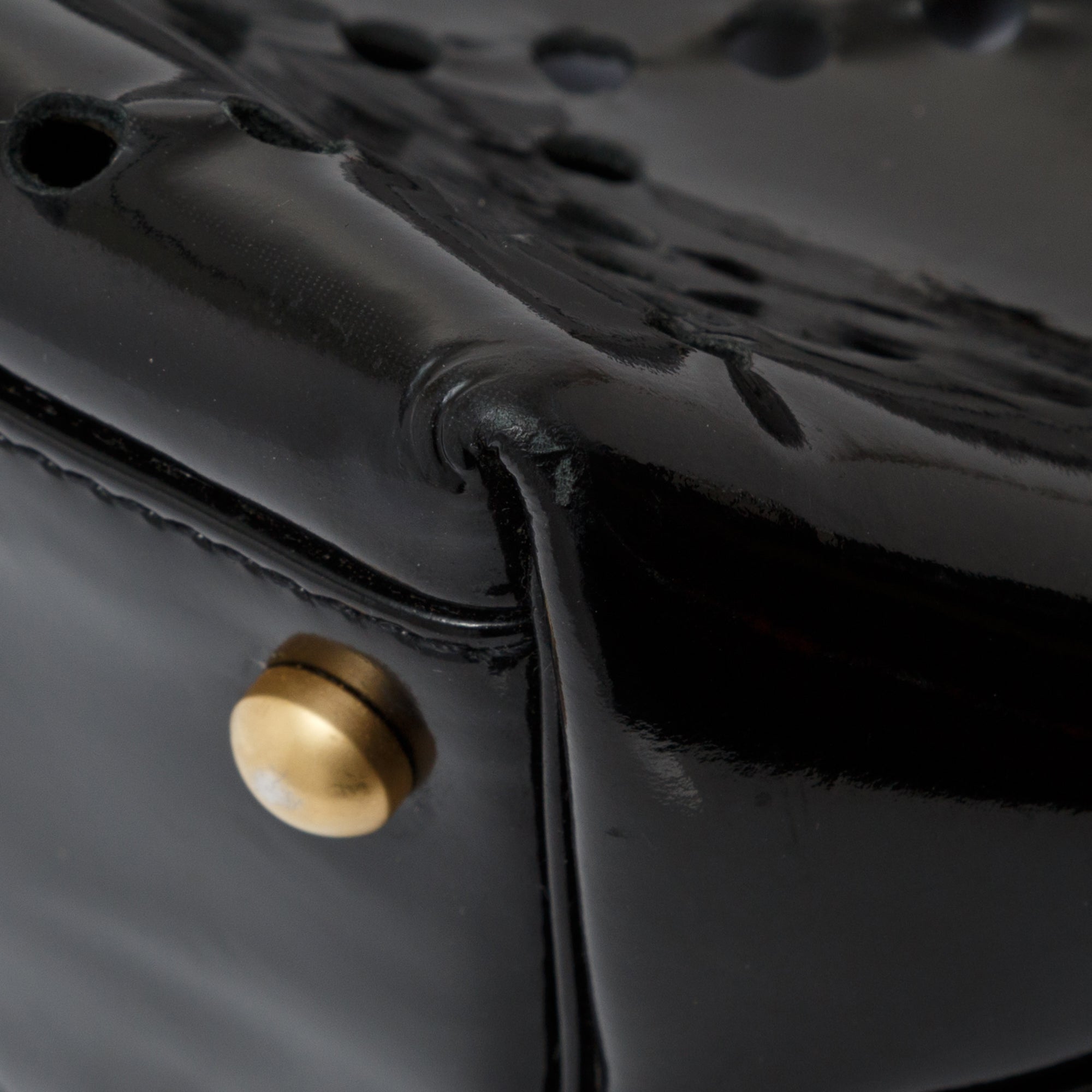 Condition: Good; slight creasing and scratches at exterior patent leather; slight scuffing at exterior bottom corners and at leather shoulder straps; slight scratches at interior leather