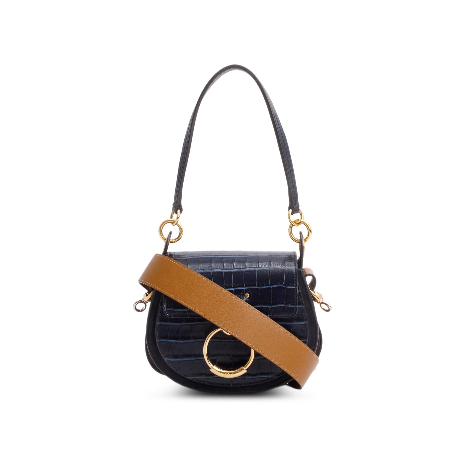 Navy Calfskin Croc Embossed Small Tess Bag w/ Strap