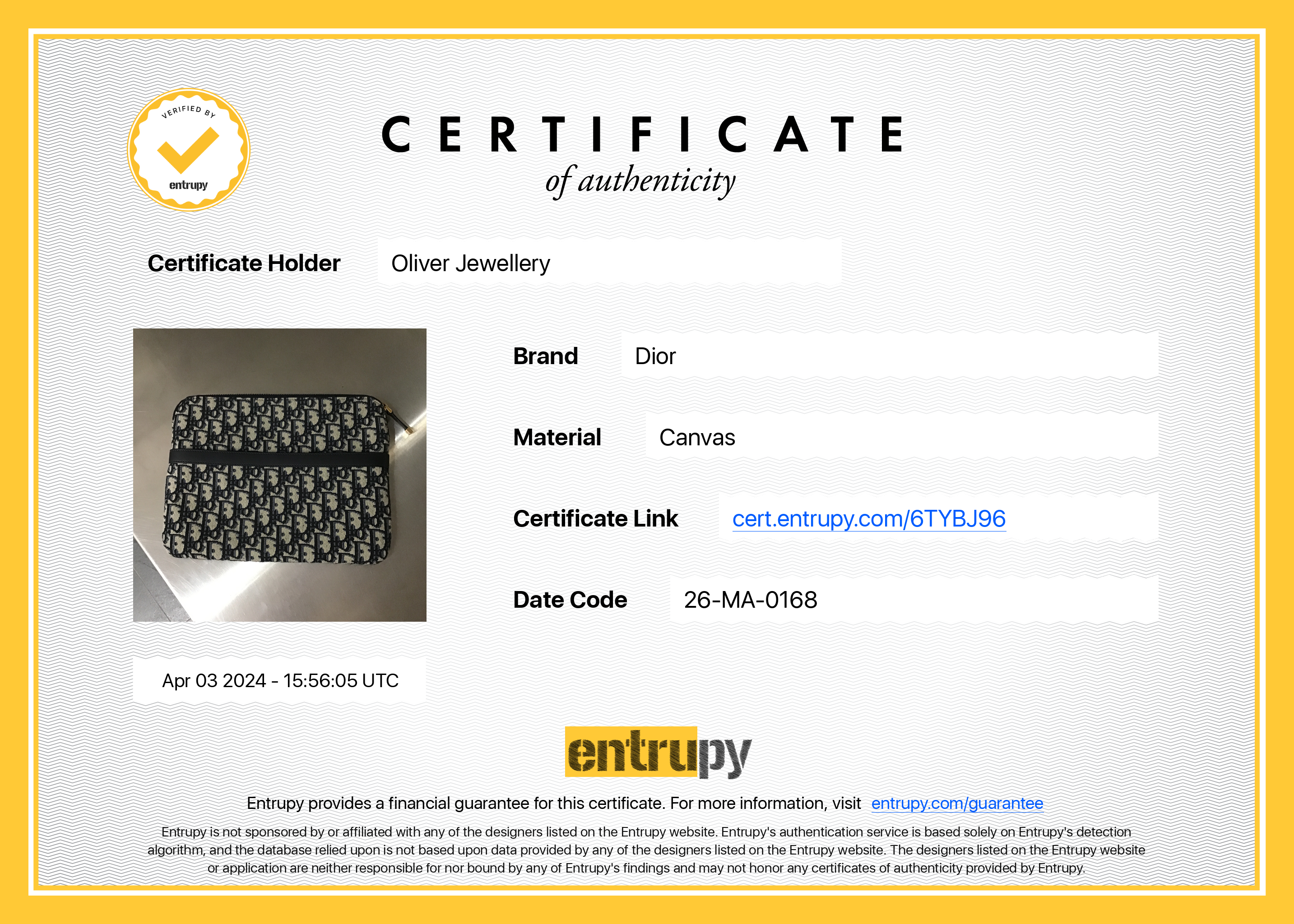 Dust Bag, Entrupy Certificate of Authenticity