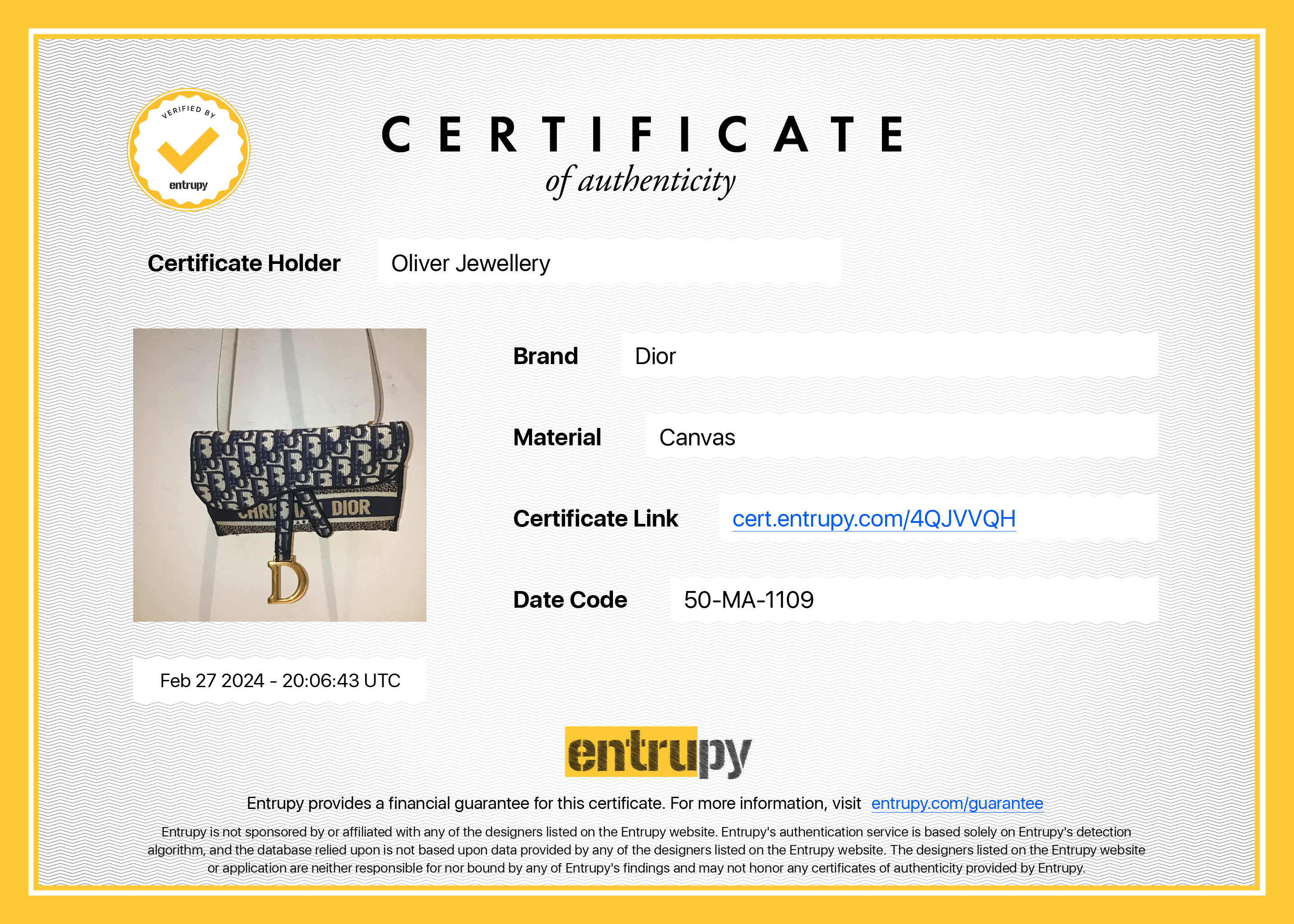 Dust Bag, Entrupy Certificate of Authenticity