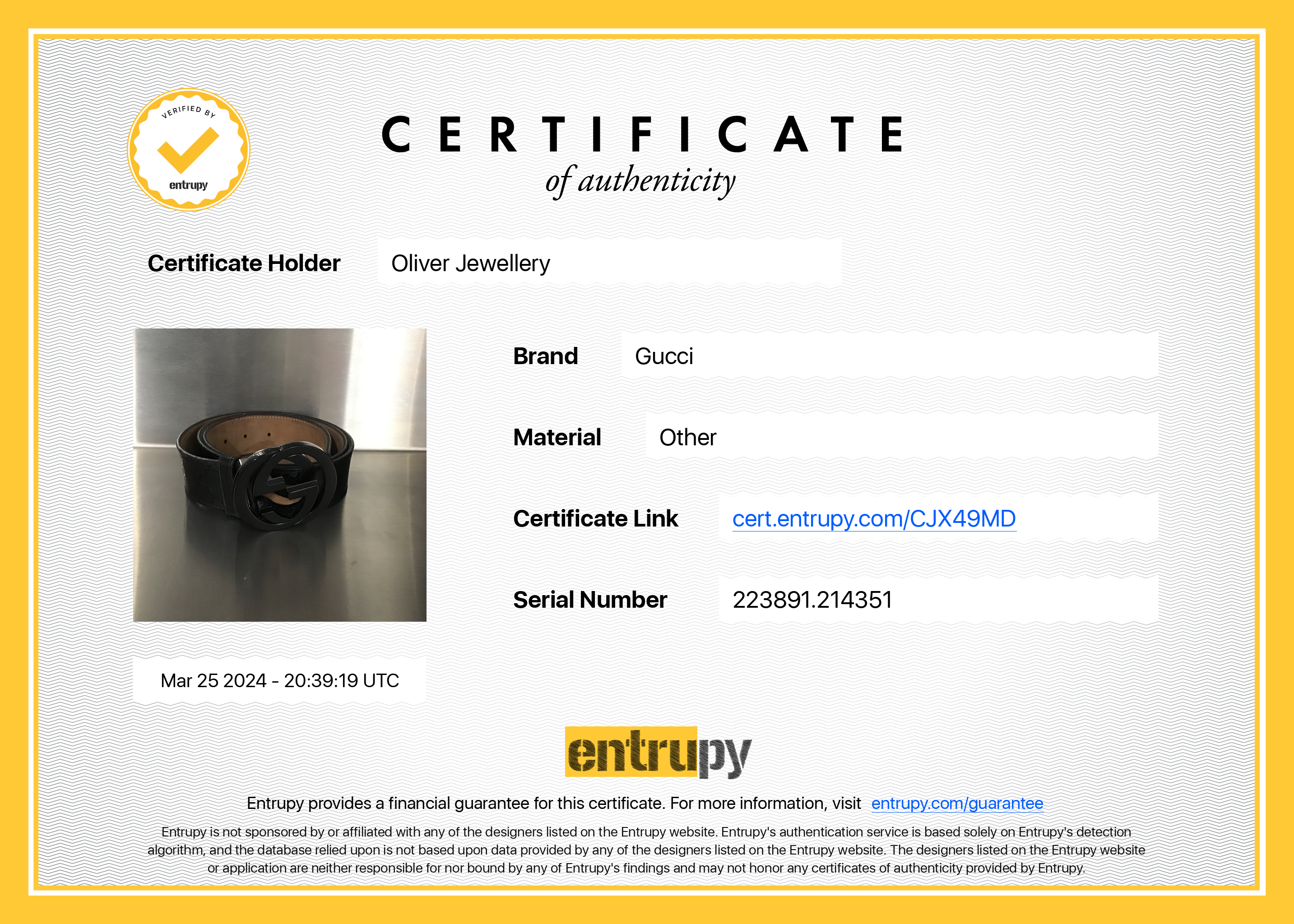 Entrupy Certificate of Authenticity