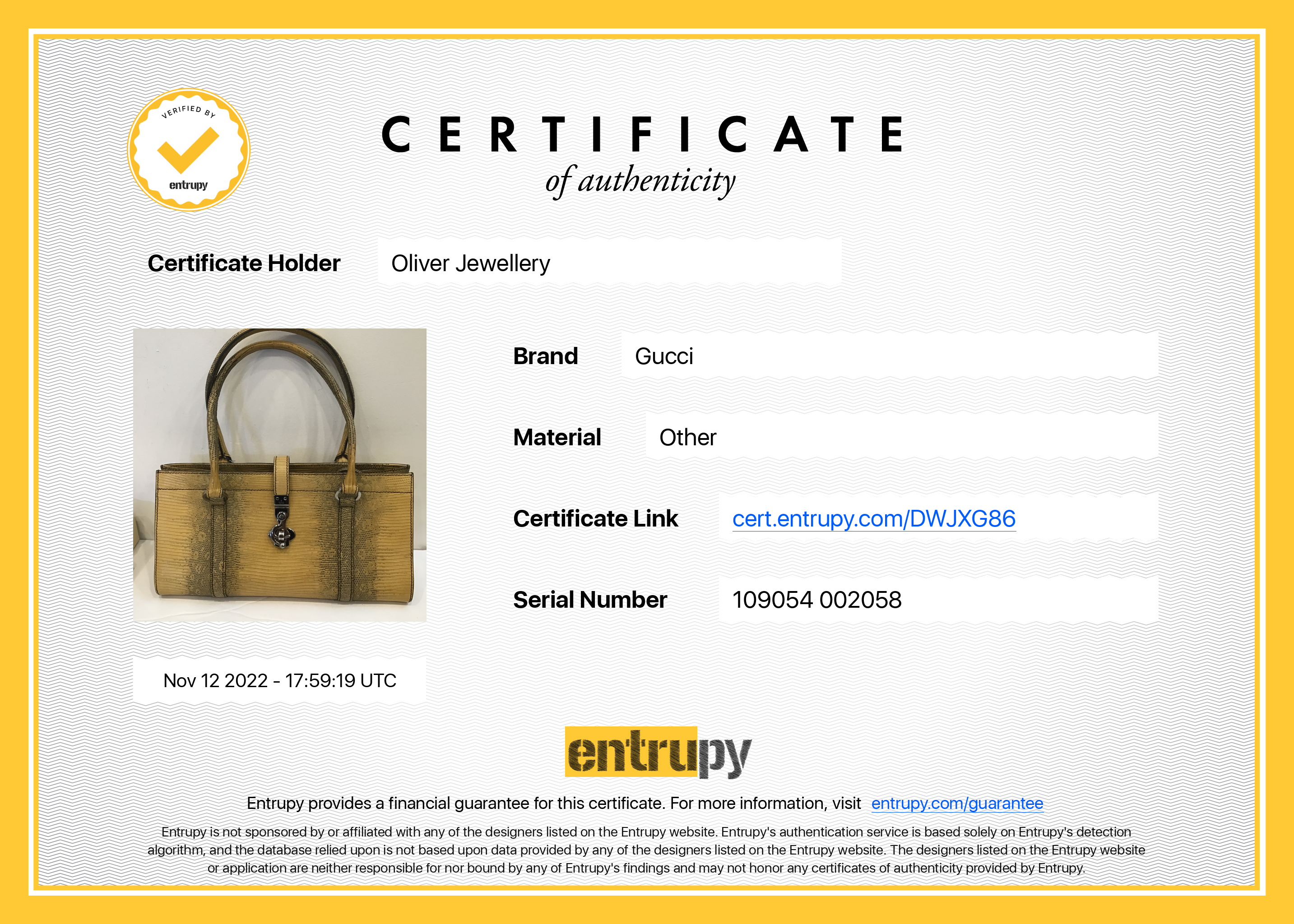 Included Items: Original Gucci Authenticity Card, Booklet & Entrupy Certificate of Authenticity #: DWJXG86
