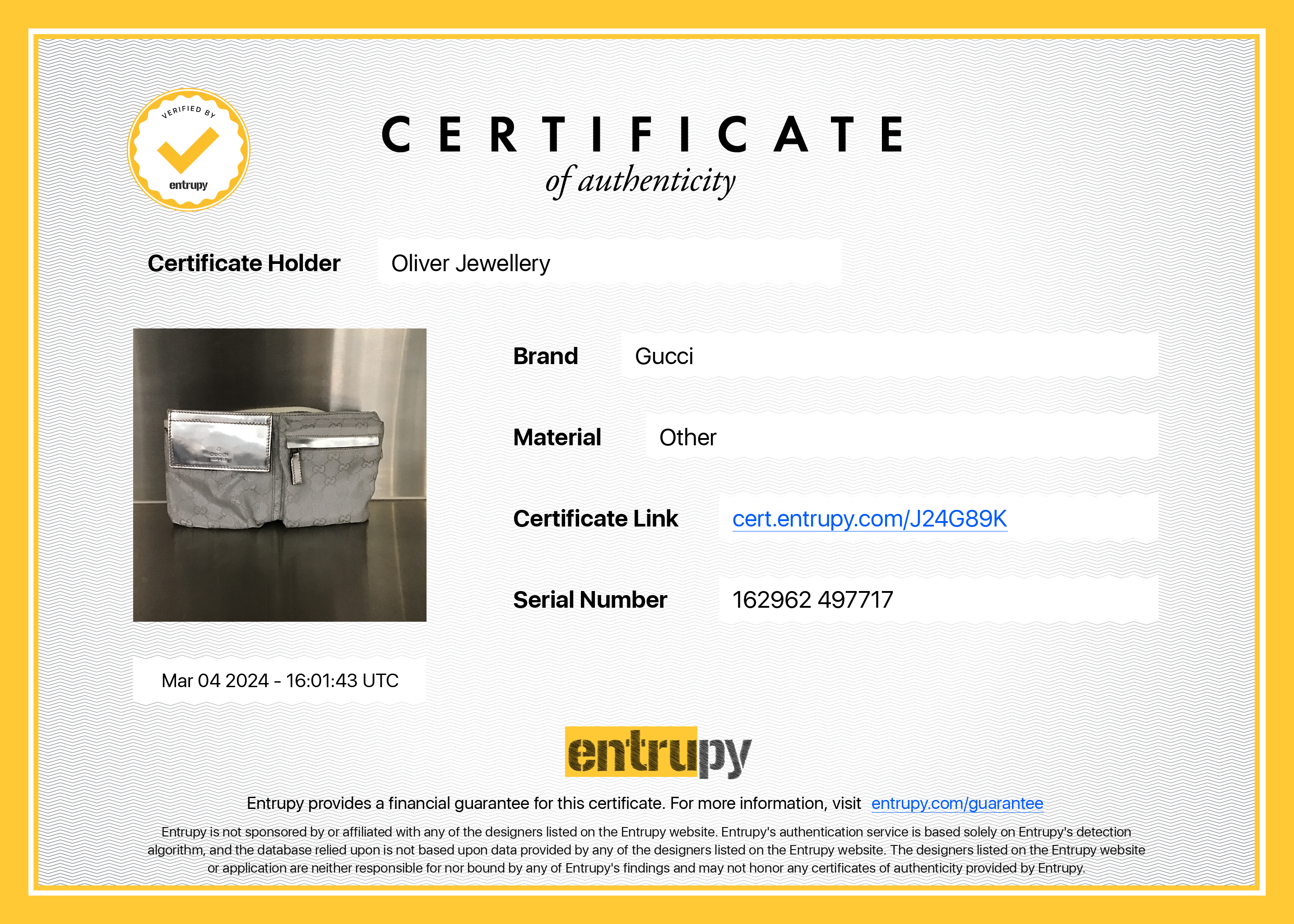 Entrupy Certificate of Authenticity