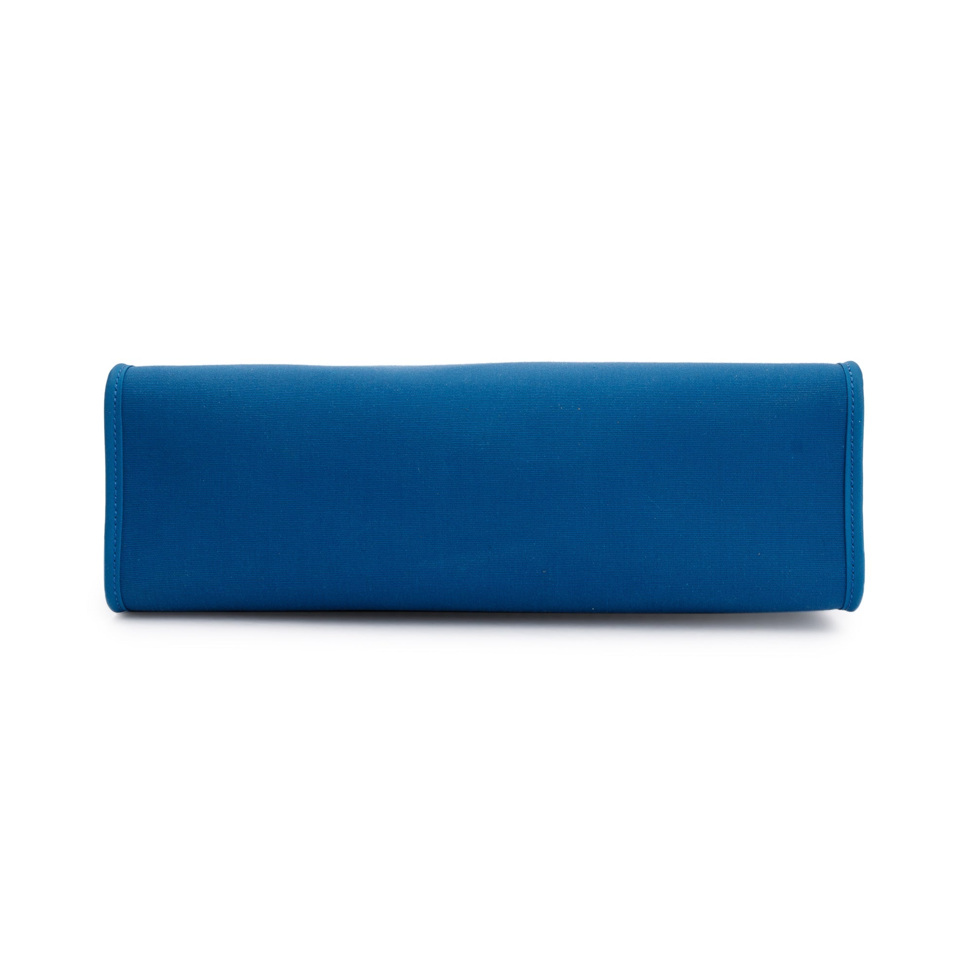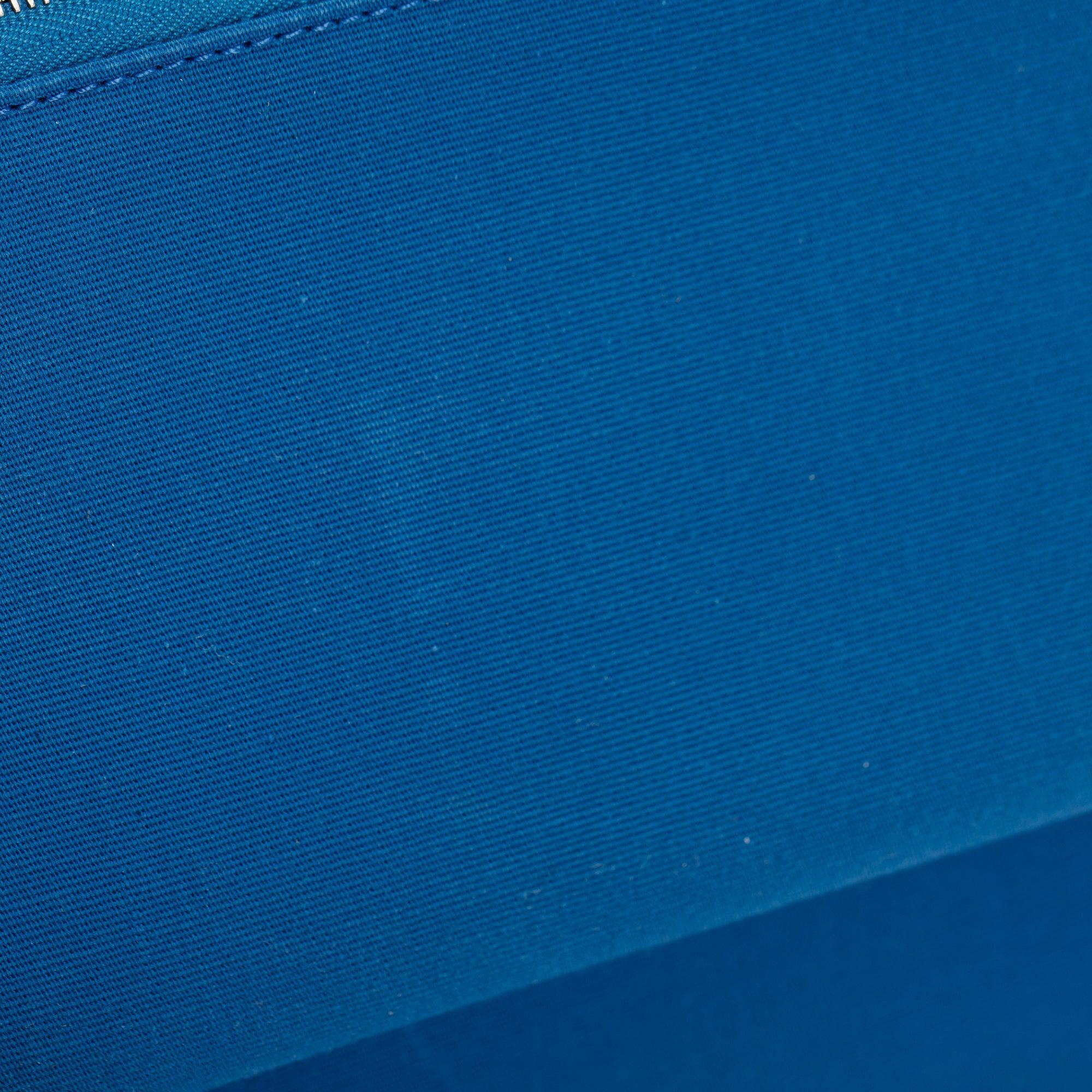 Condition: Very Good; slight scratches at exterior leather trim and top handle; light marks at canvas