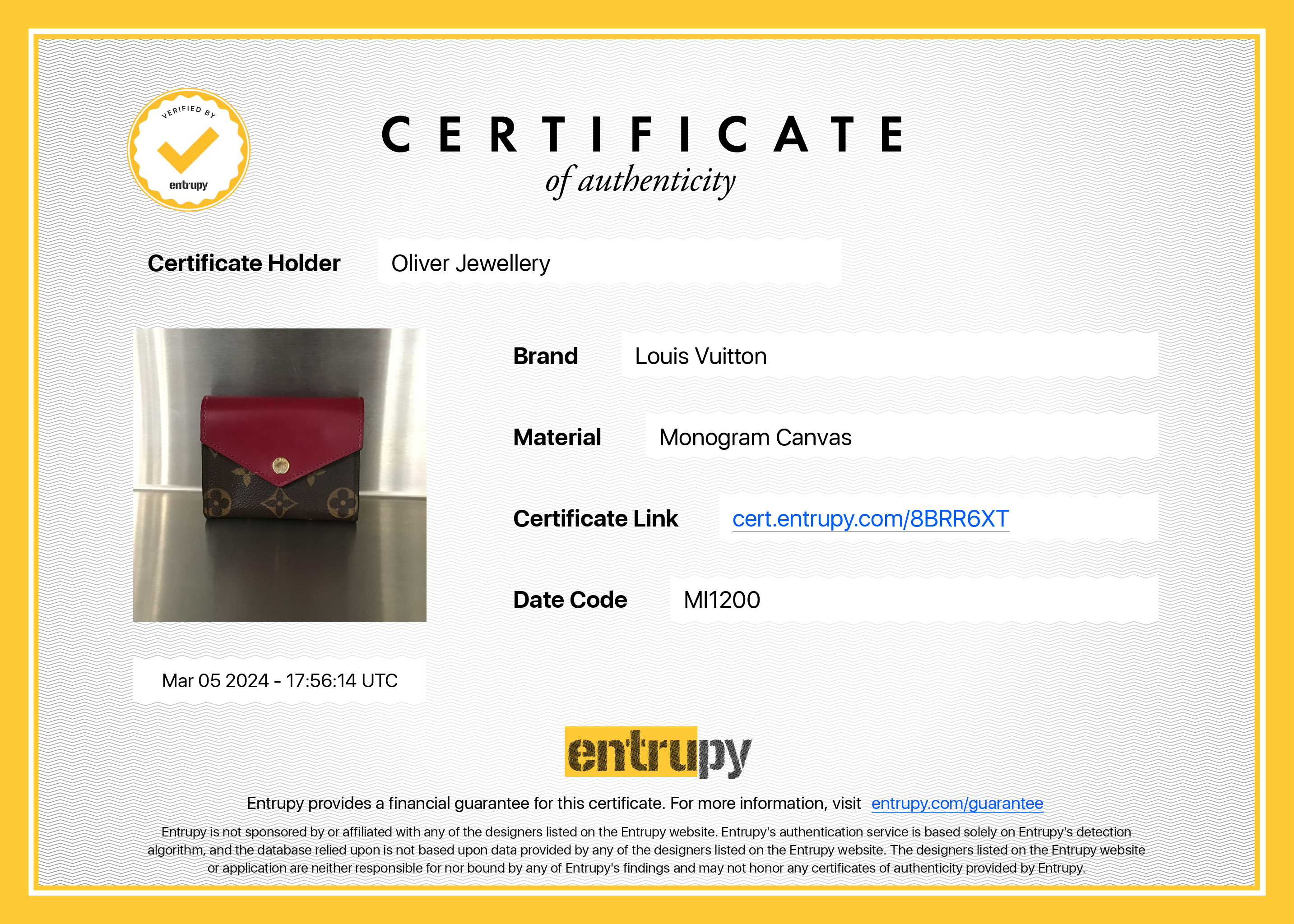 Entrupy Certificate of Authenticity