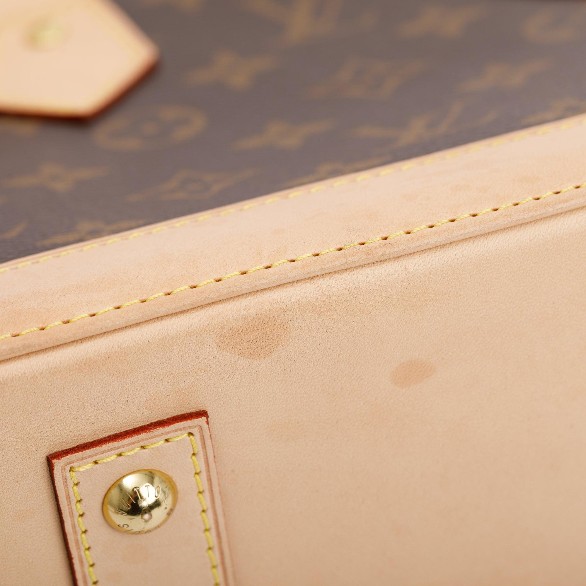 Condition: Very Good; minor surface scratches at hardware; slight marks at exterior tan vachetta leather trim, handles and at base; clean interior