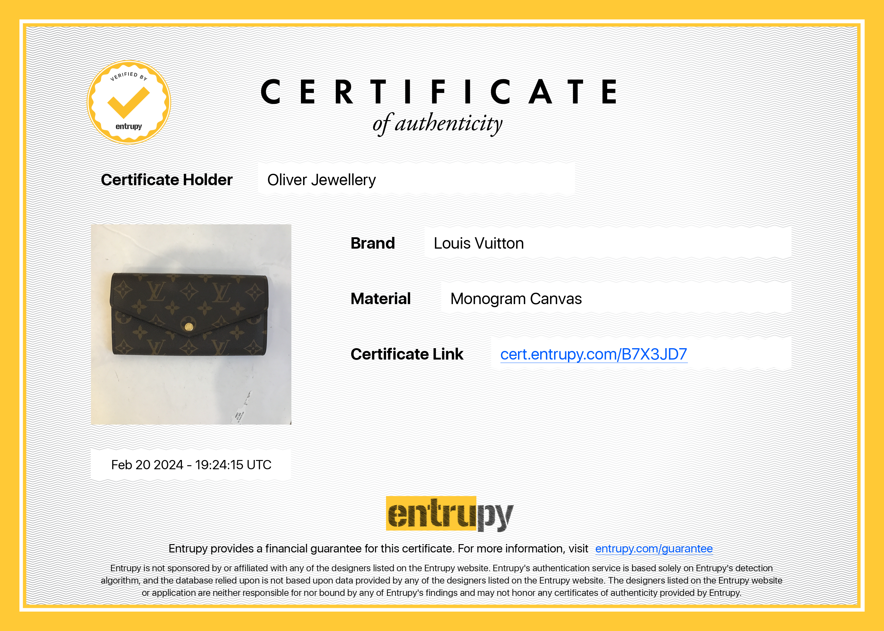 Entrupy Certificate of Authenticity