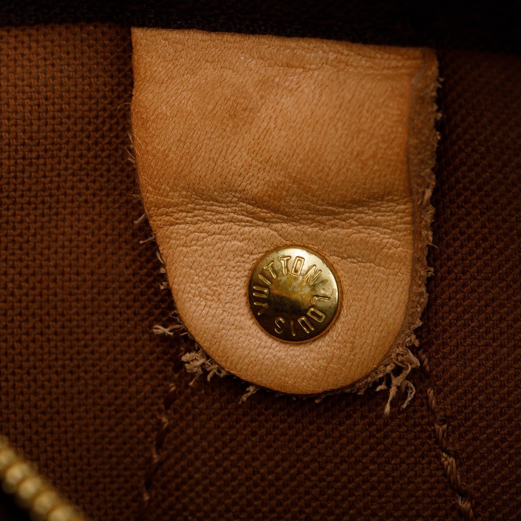 Condition: Very Good; slight scratches at hardware; slight scratches and marks at exterior vachetta leather trim and handles; Initials 'MEA' hot stamped at handle base; clean interior