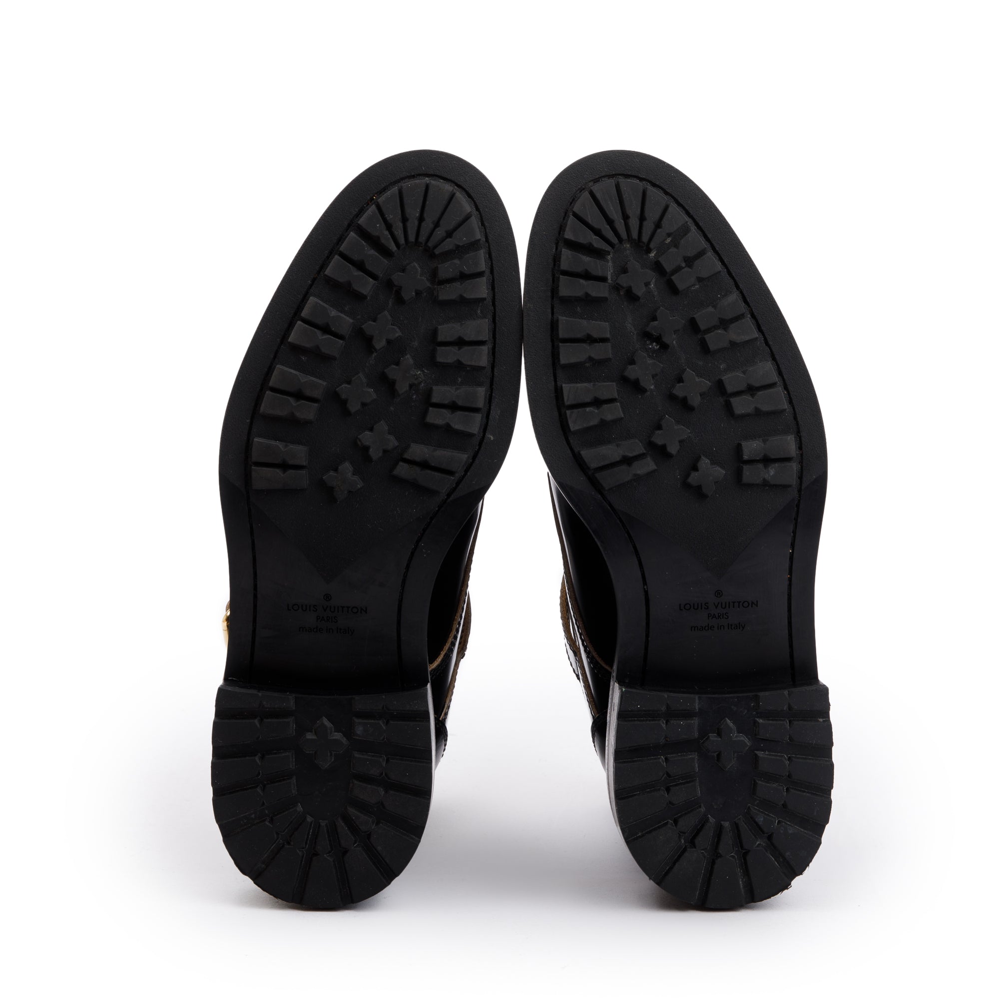 Condition: Very Good; slight creasing at leather; slight marks and wear at soles