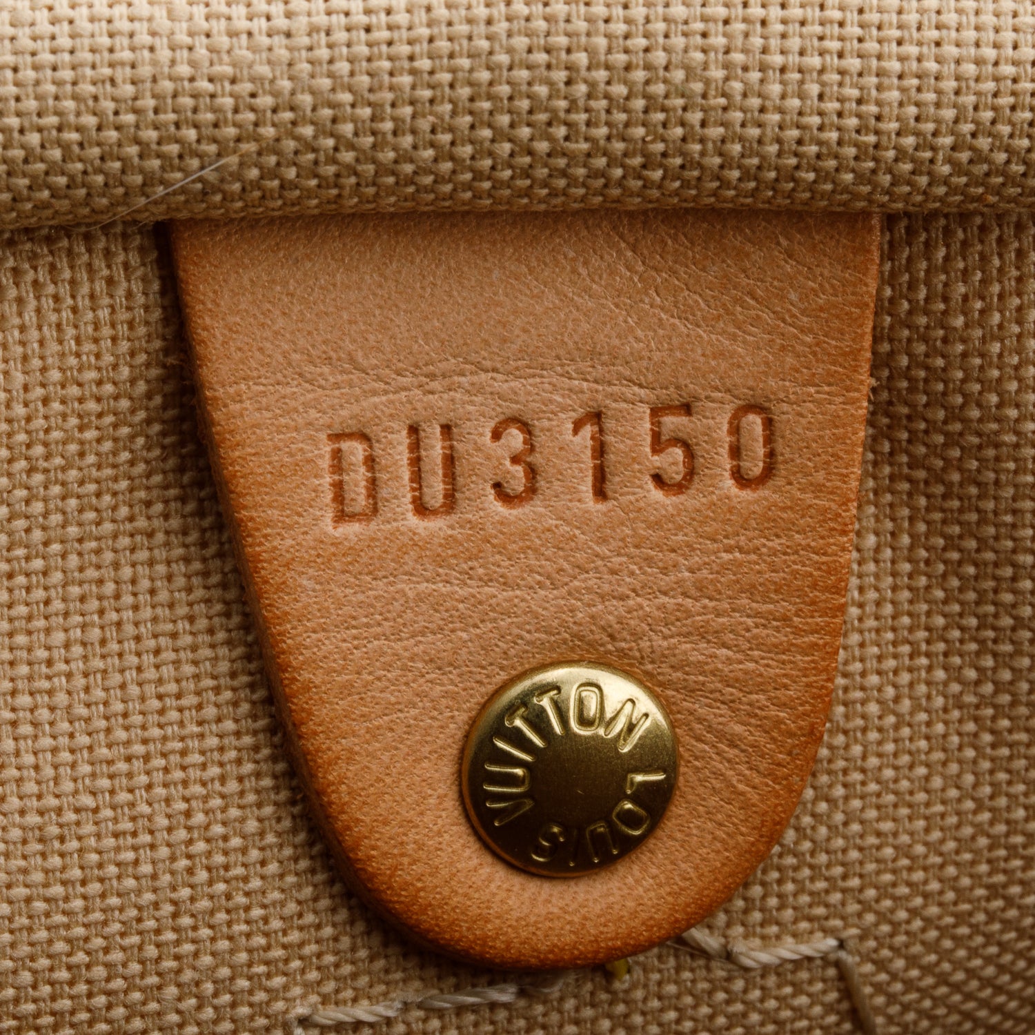 Condition: Very Good; slight tarnishing at hardware; some discoloration at exterior vachetta and handles; initials 'J18' hot stamped at leather tab; slight marks at interior.