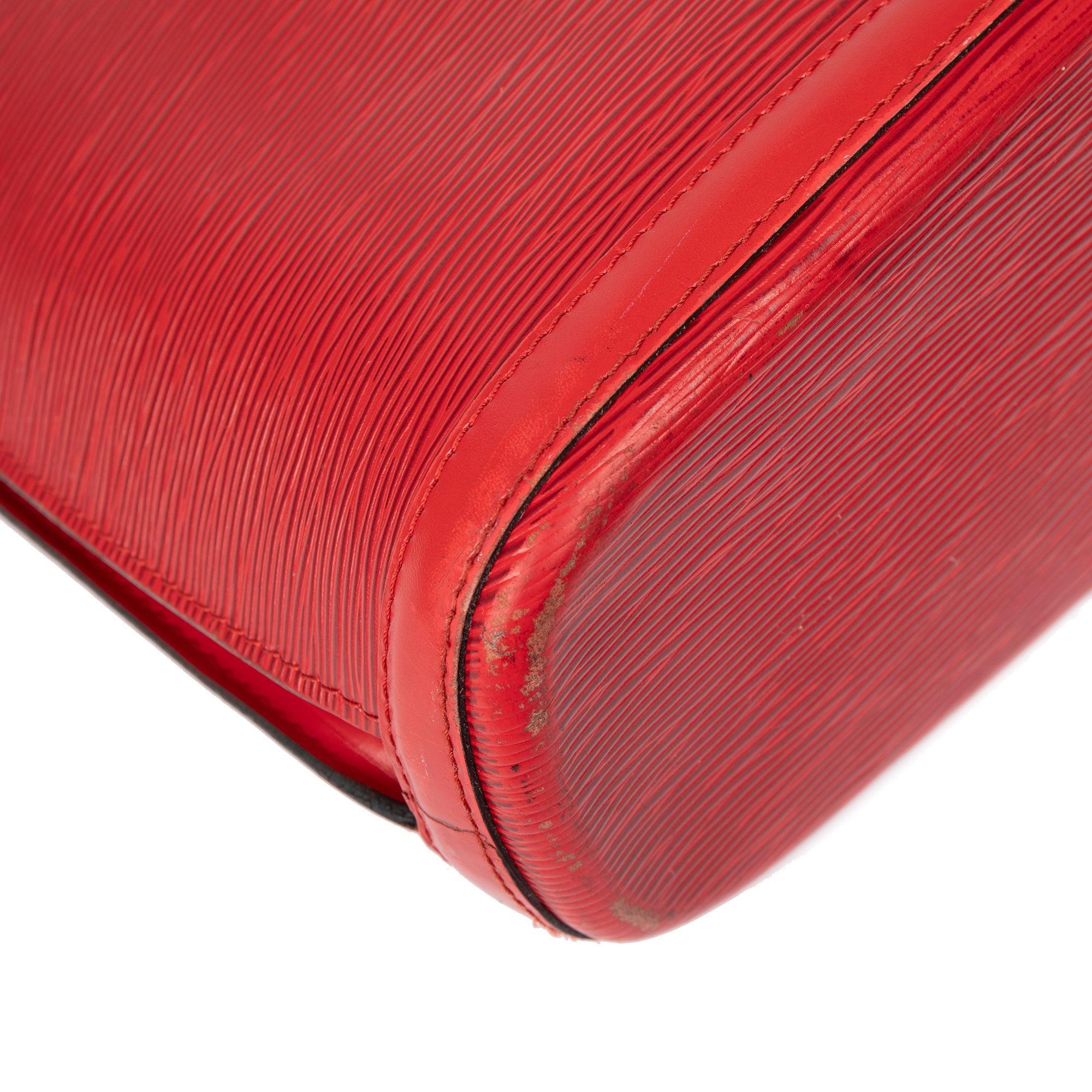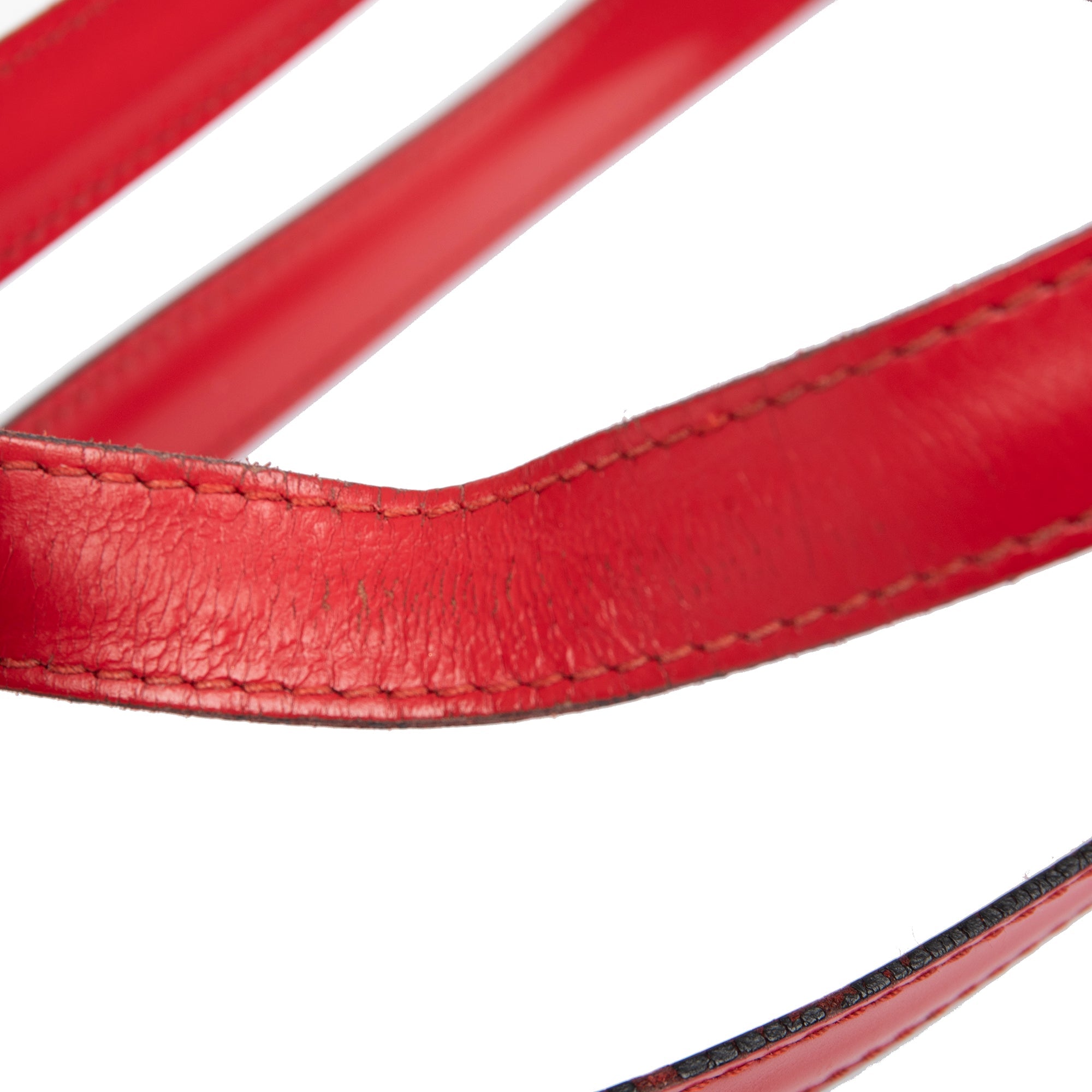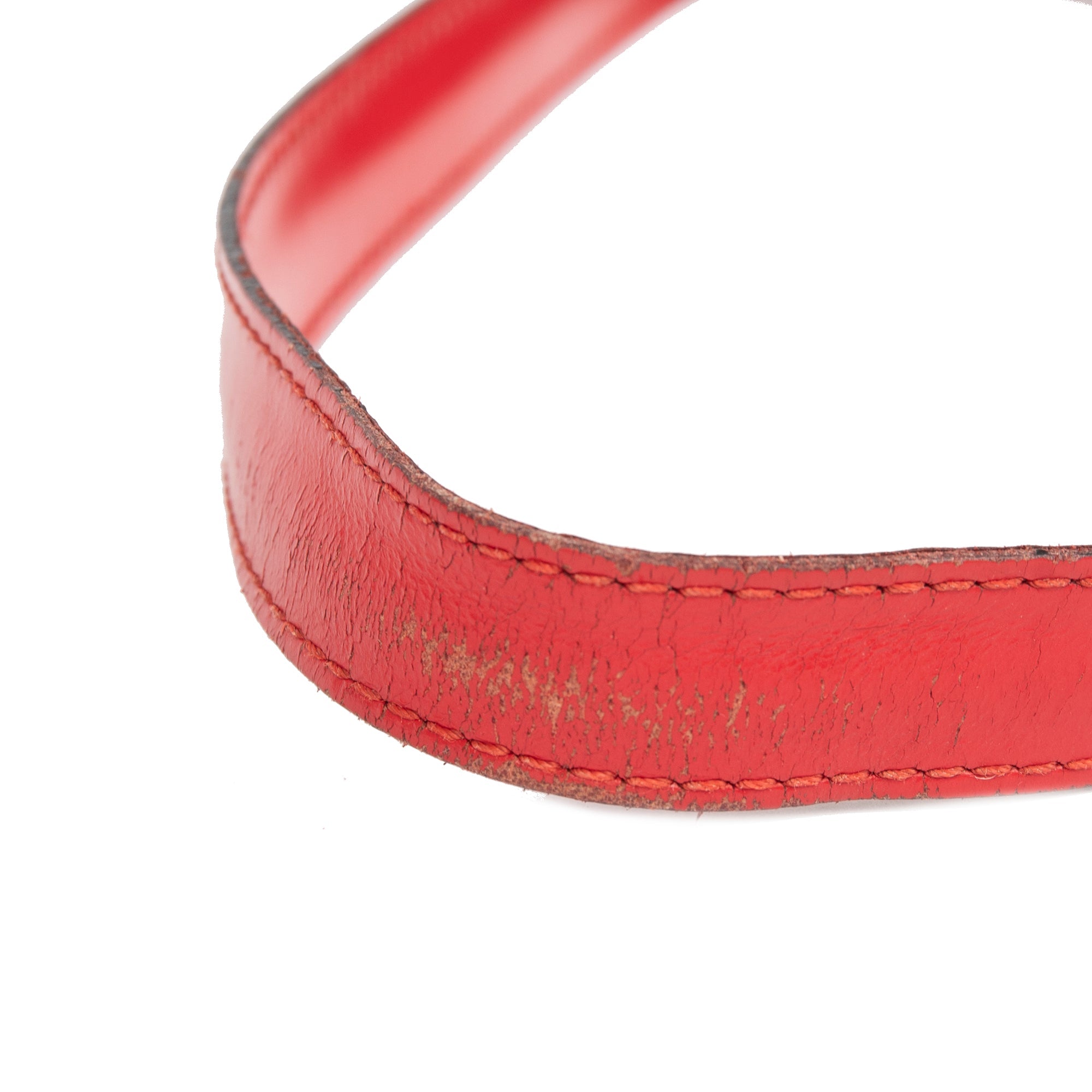 Condition: Good; some surface scratches and tarnishing at hardware; slight scuffing and marks at exterior leather; some scuffing at base edges and shoulder strap; some darkening at interior lining