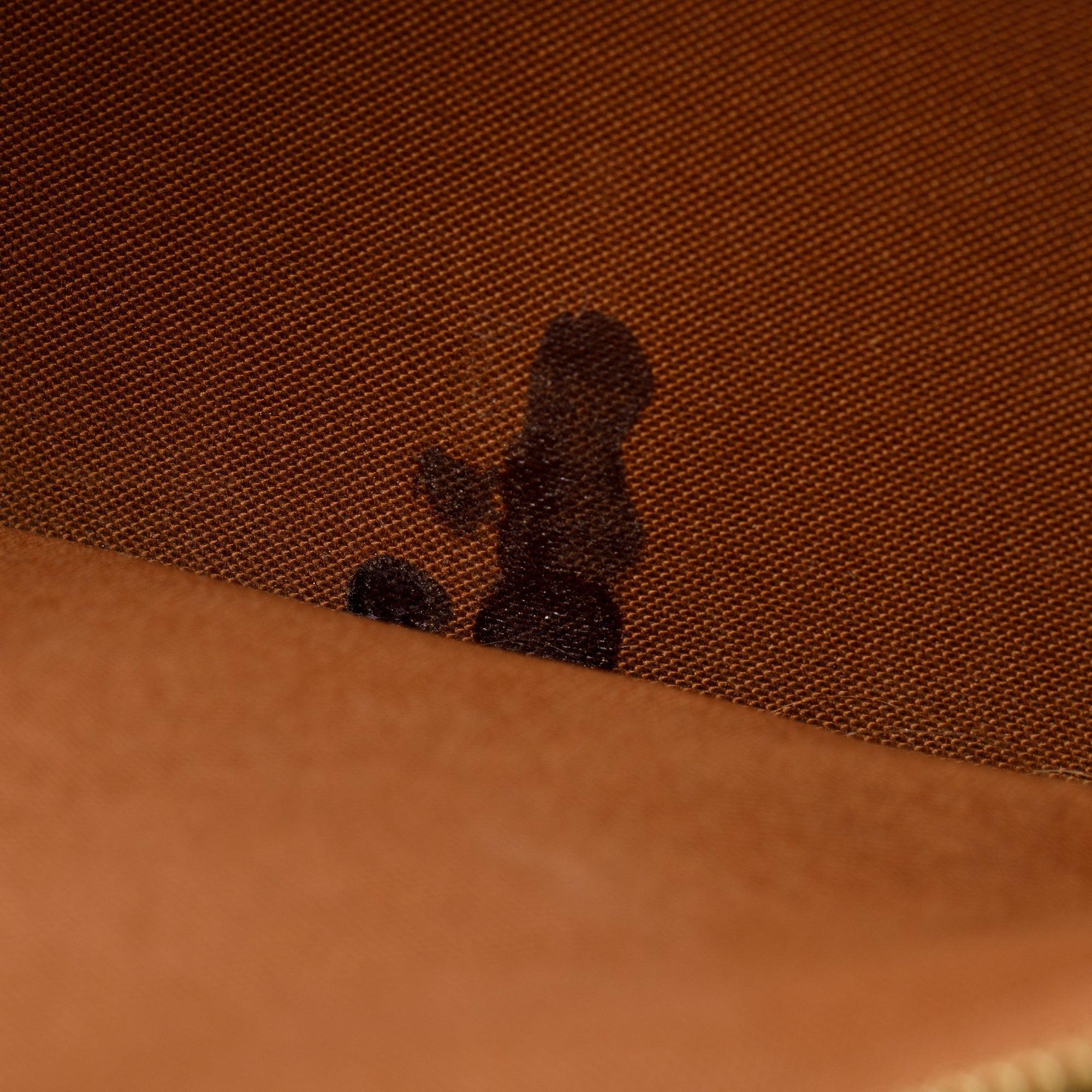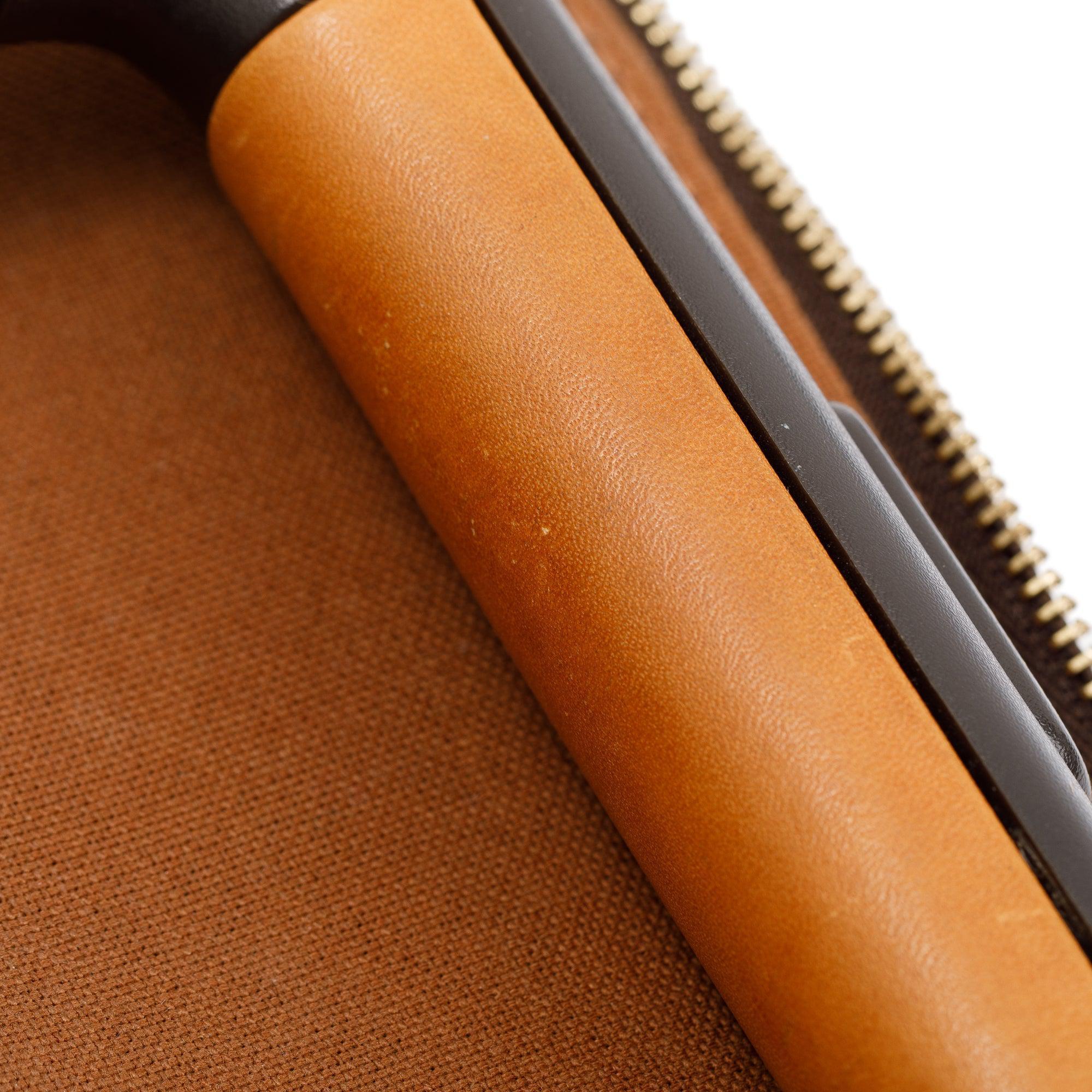 Condition: Good; light tarnishing at hardware; some scratches and marks at exterior vachetta leather trim and handles;  slight scratches at exterior base and wheels; some  staining at interior