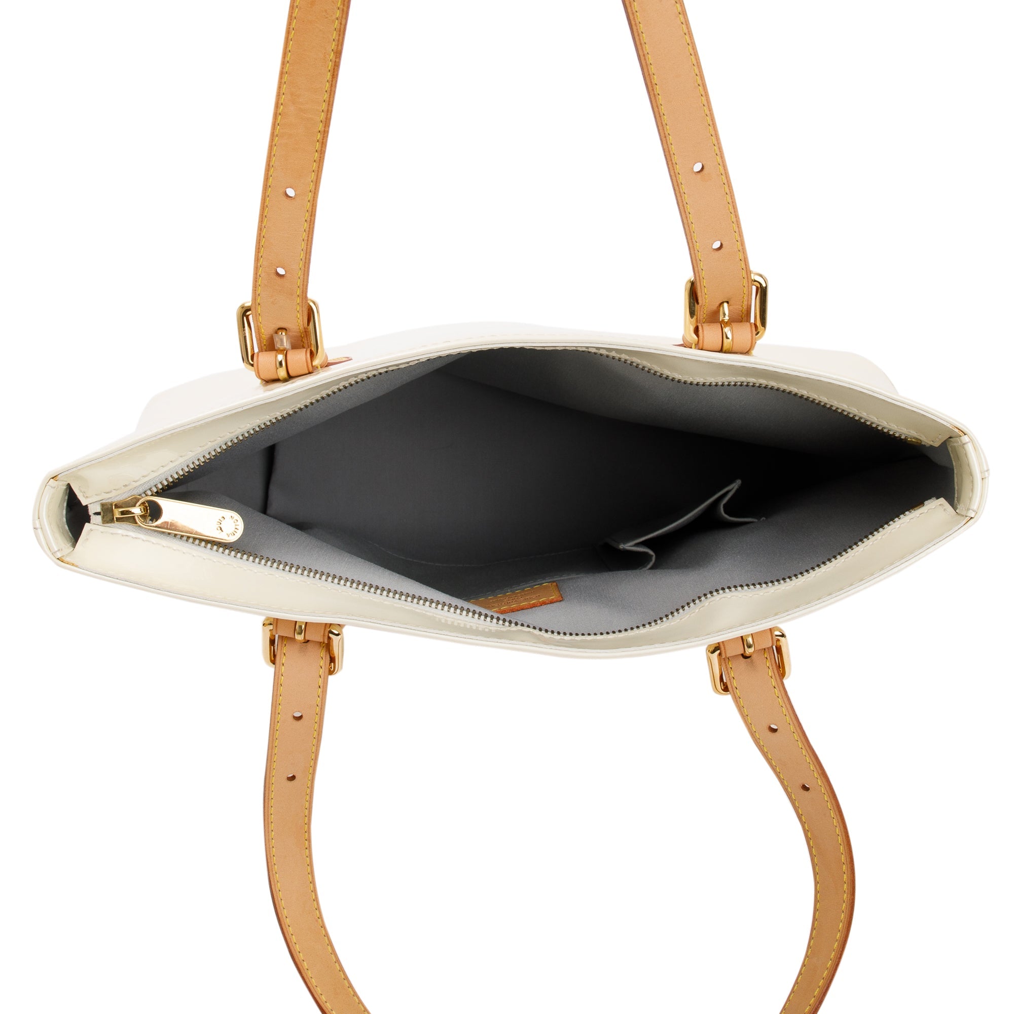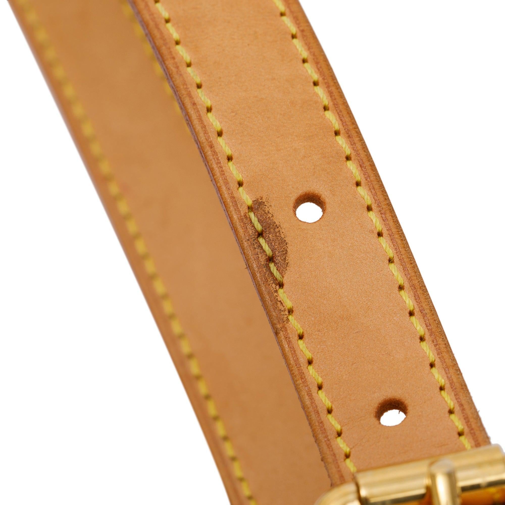 Condition: Very Good; slight marks at leather strap; light marks at exterior bottom; light marks at interior