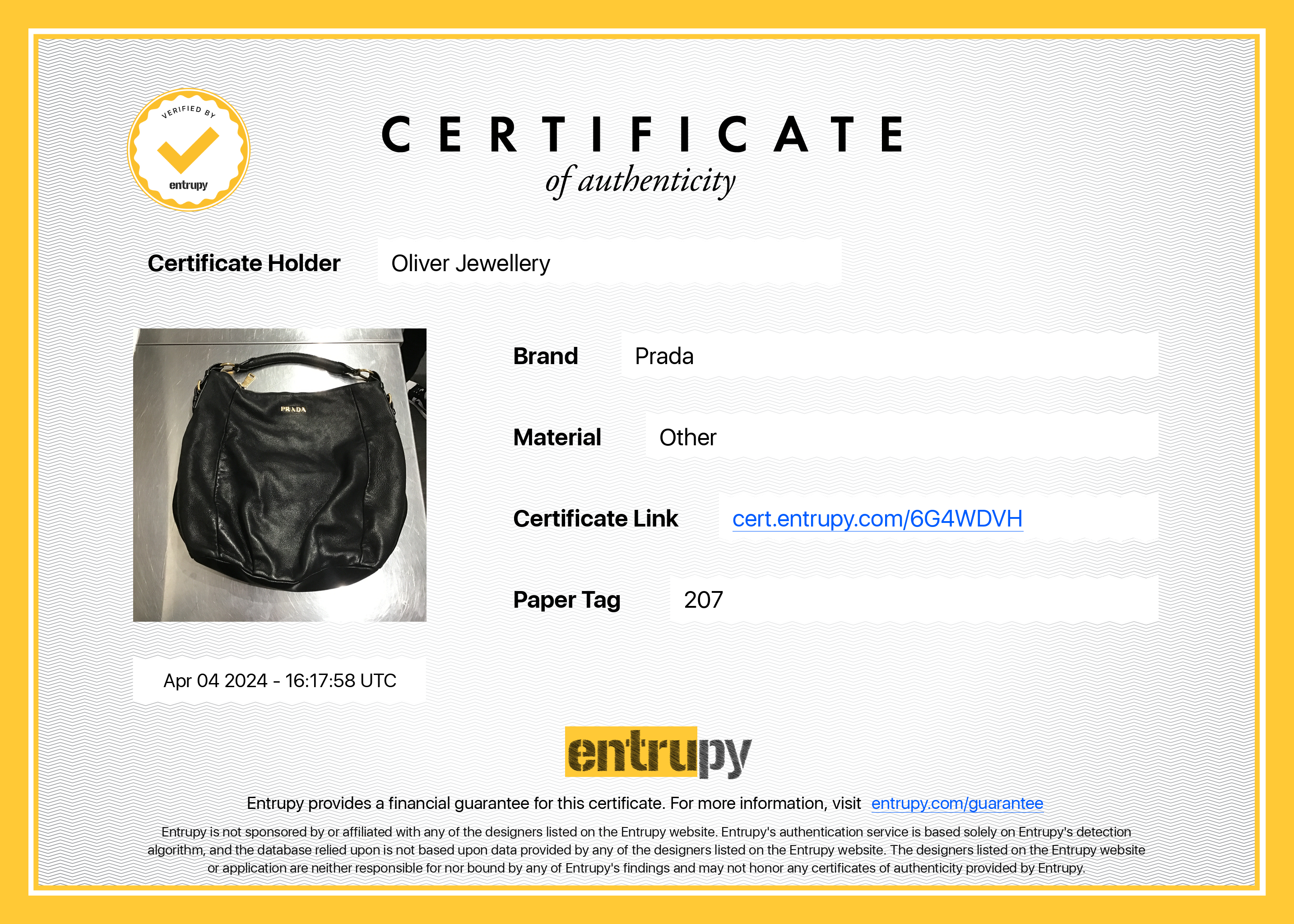 Entrupy Certificate of Authenticity