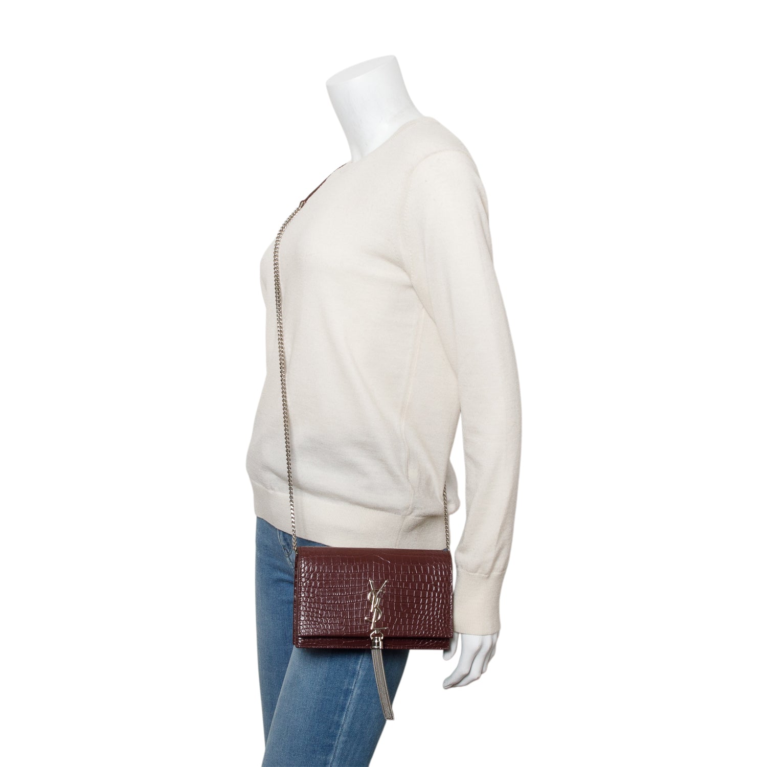 Burgundy Croc Embossed Leather Kate Tassel Wallet on Chain