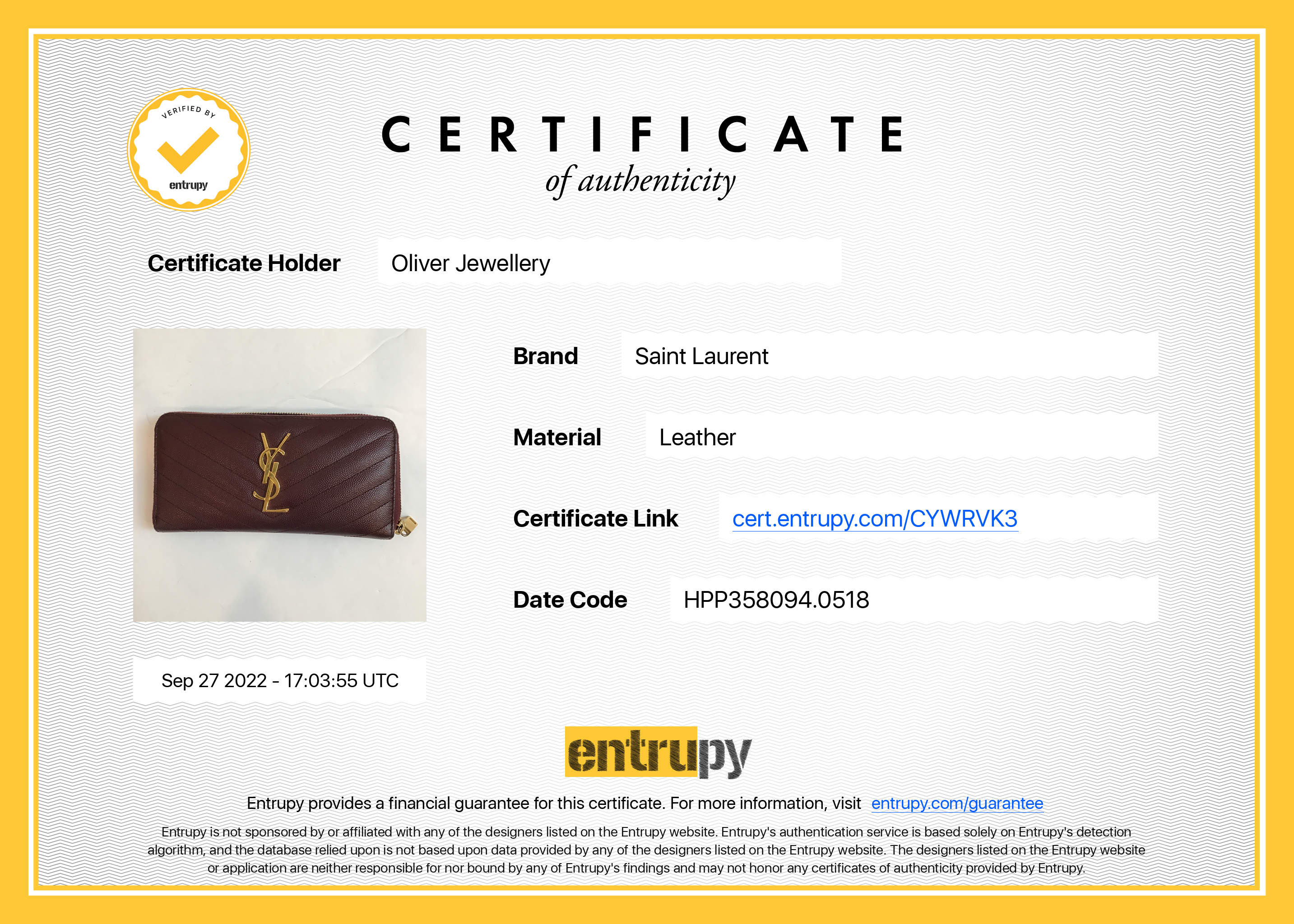Included Items: Entrupy Certificate of Authenticity #: CYWRVK3