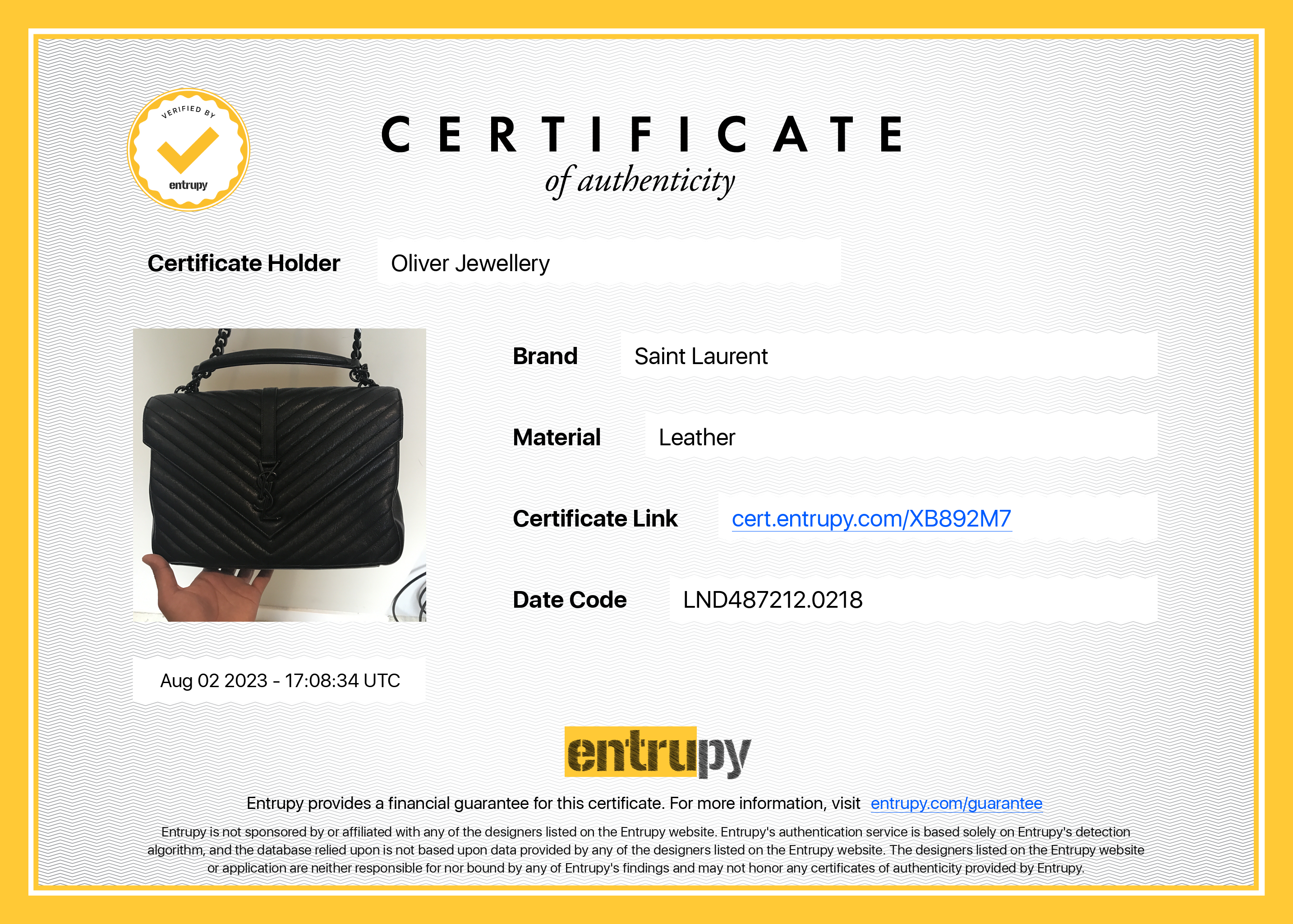 Included Items: Original Saint Laurent Dust Bag & Entrupy Certificate of Authenticity #: XB892M7