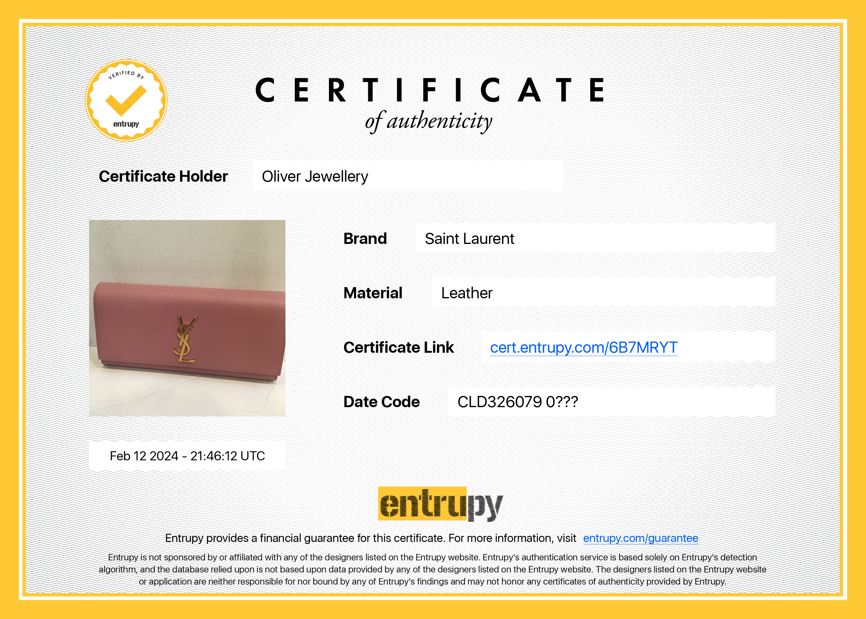 Entrupy Certificate of Authenticity