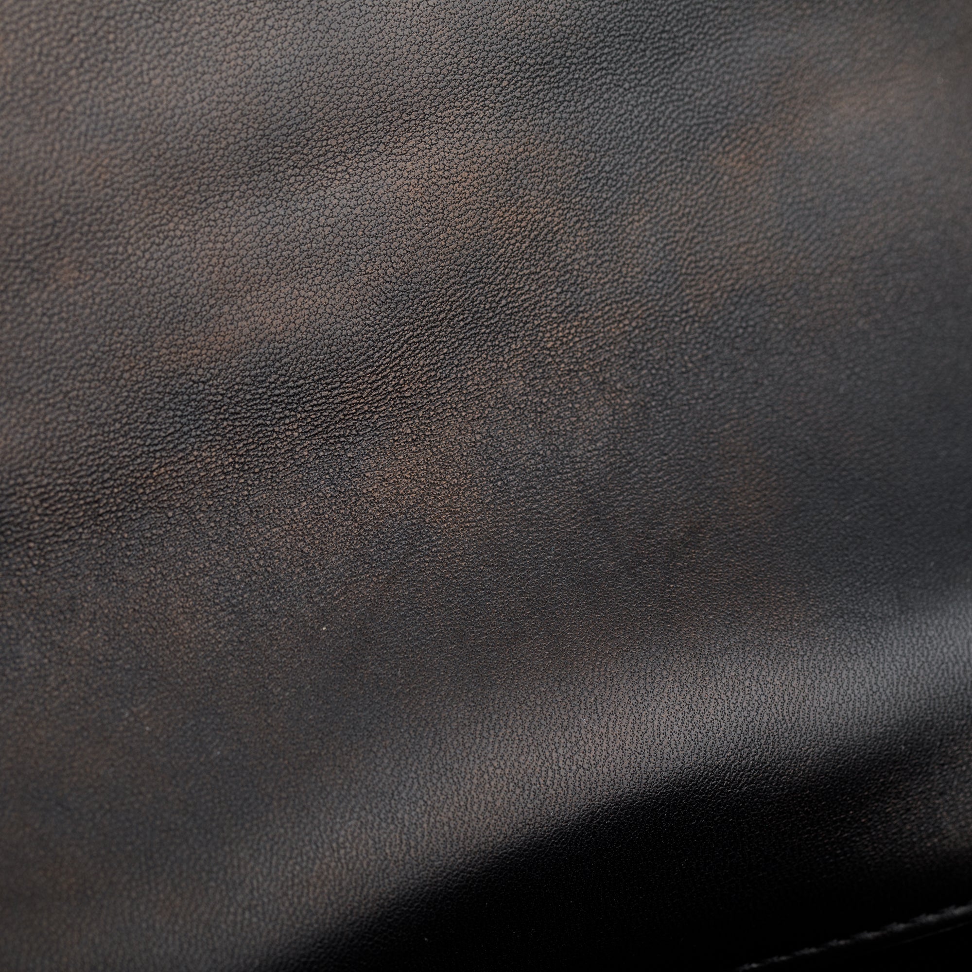 Condition: Good; slight scratches at hardware; slight staining under front flap; light scuffing at exterior corners; slight scratches at flap underside; clean interior