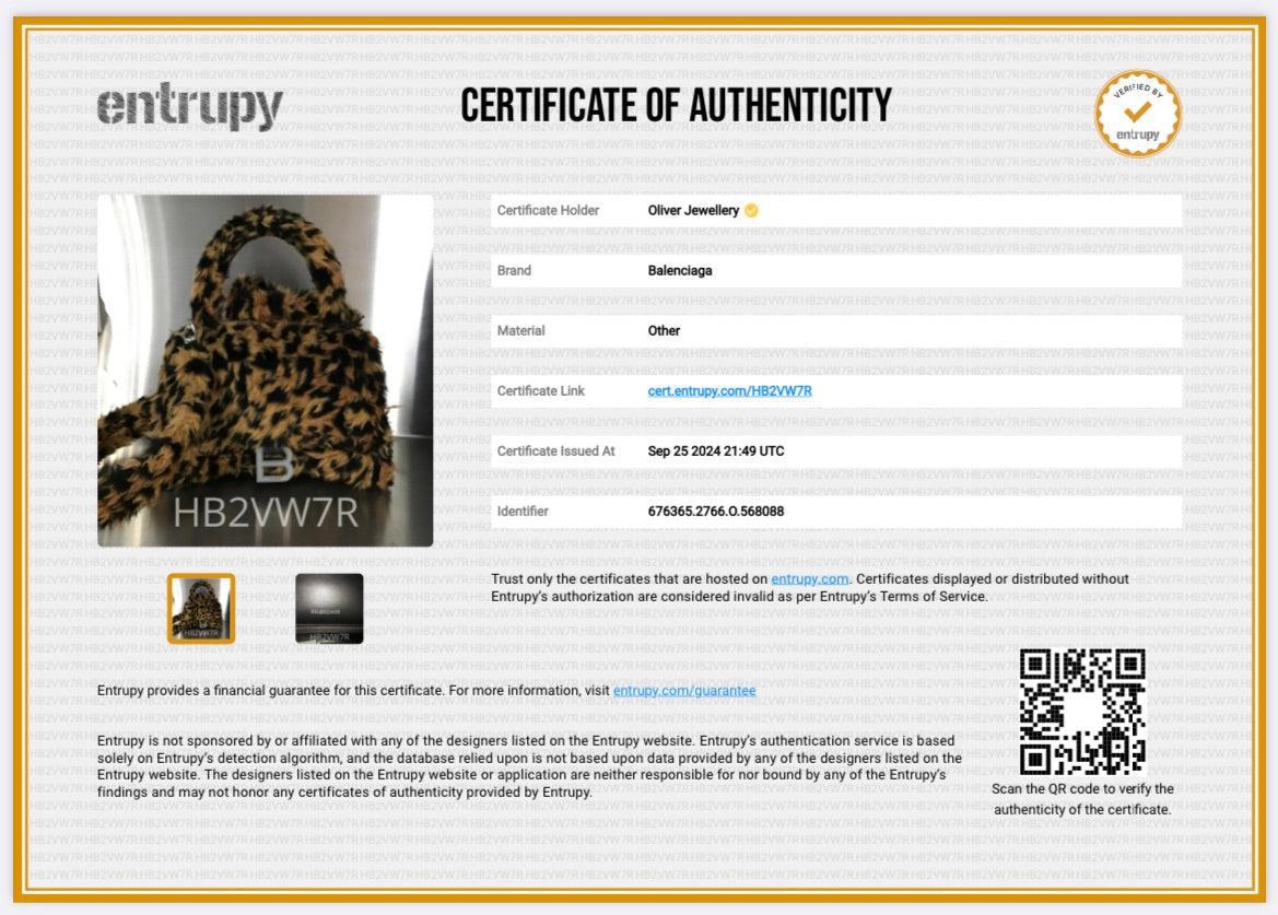 Dust Bag, Tag, Strap, Entrupy Certificate of Authenticity