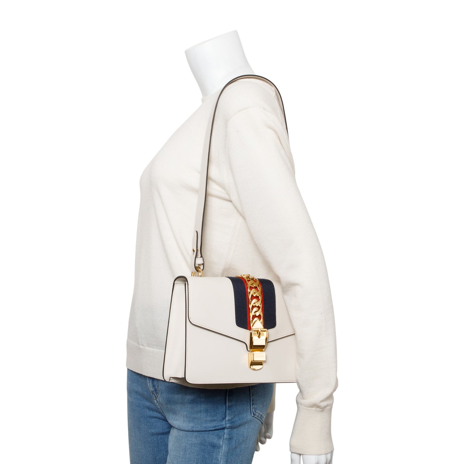 White Calfskin Leather Small Sylvie Handle Bag w/ Straps