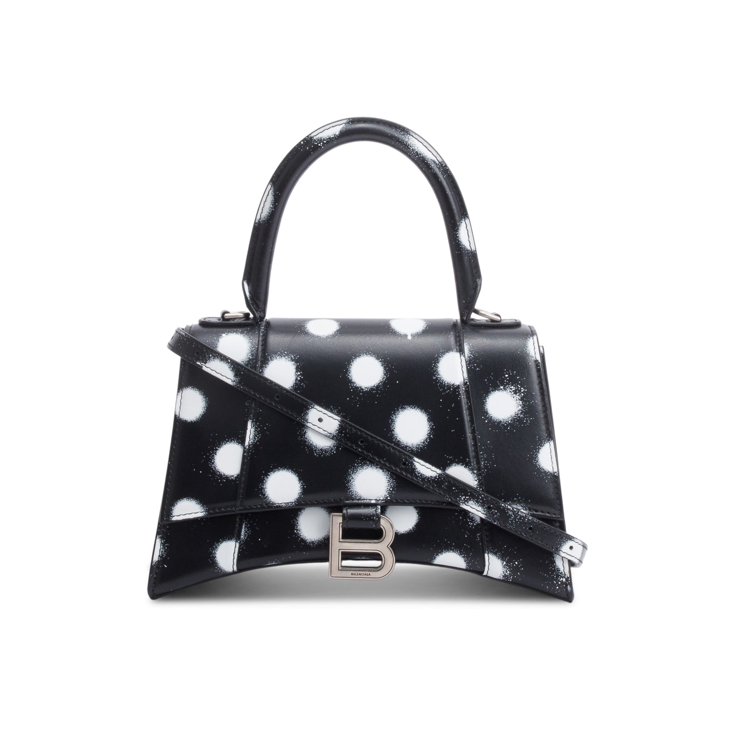 Black Smooth Leather Spray Polka Dot Small Hourglass Top Handle Bag w/ Strap