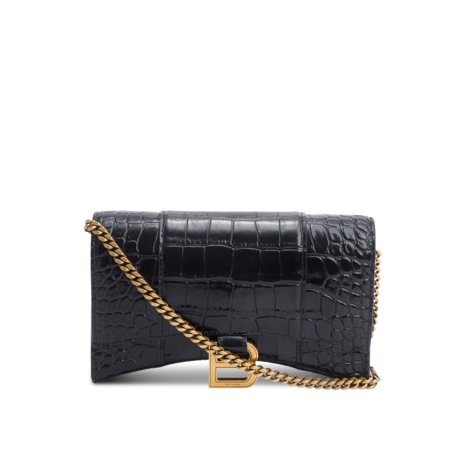 Black Shiny Calfskin Croc Embossed Hourglass Wallet on Chain