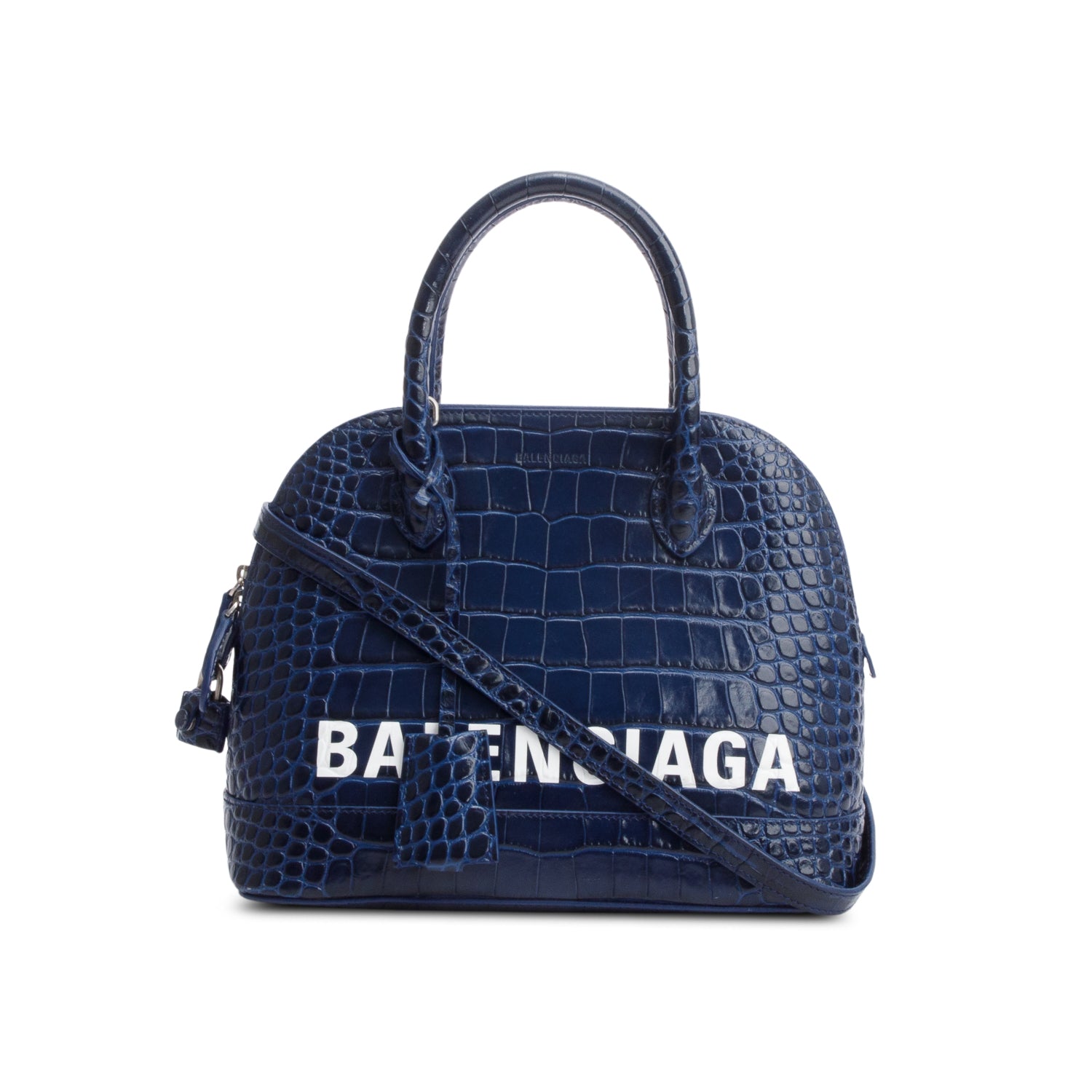 Navy Shiny Calfskin Logo Croc Embossed S Ville Top Handle Bag w/ Strap