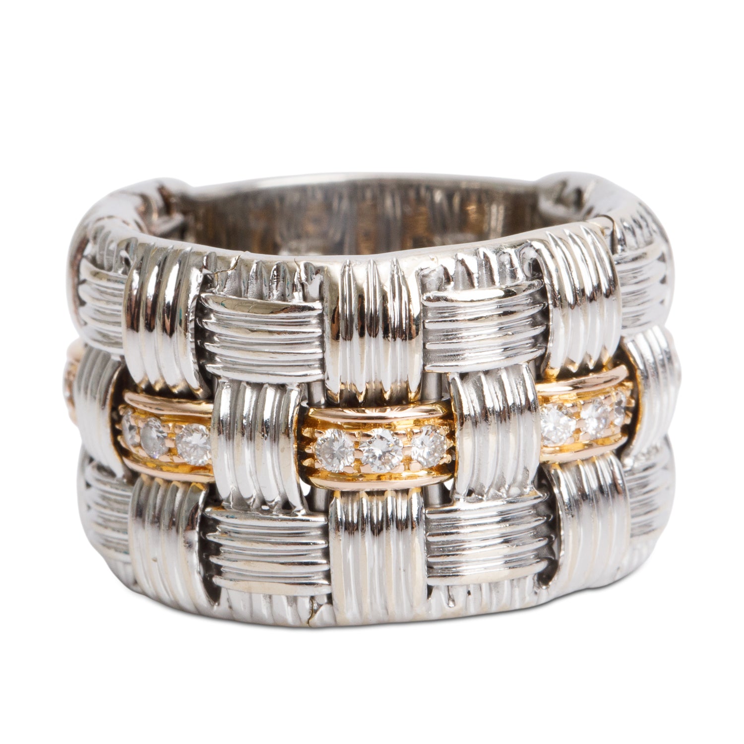 18k White and Rose Gold Diamond Weave Wide Band Ring, Size 6.5 w/ Box