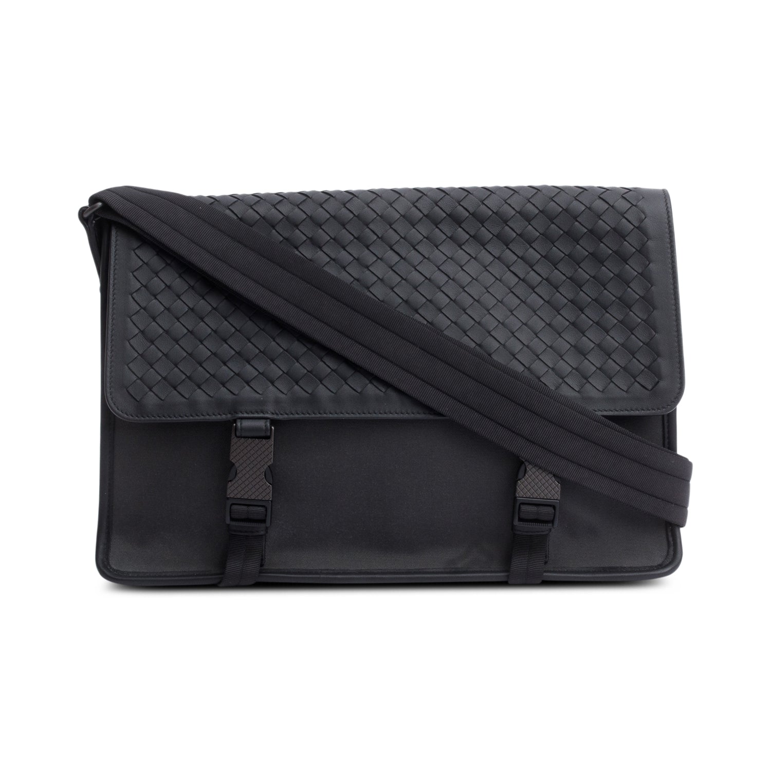 Black Intrecciato Leather Canvas Flap Messenger Bag