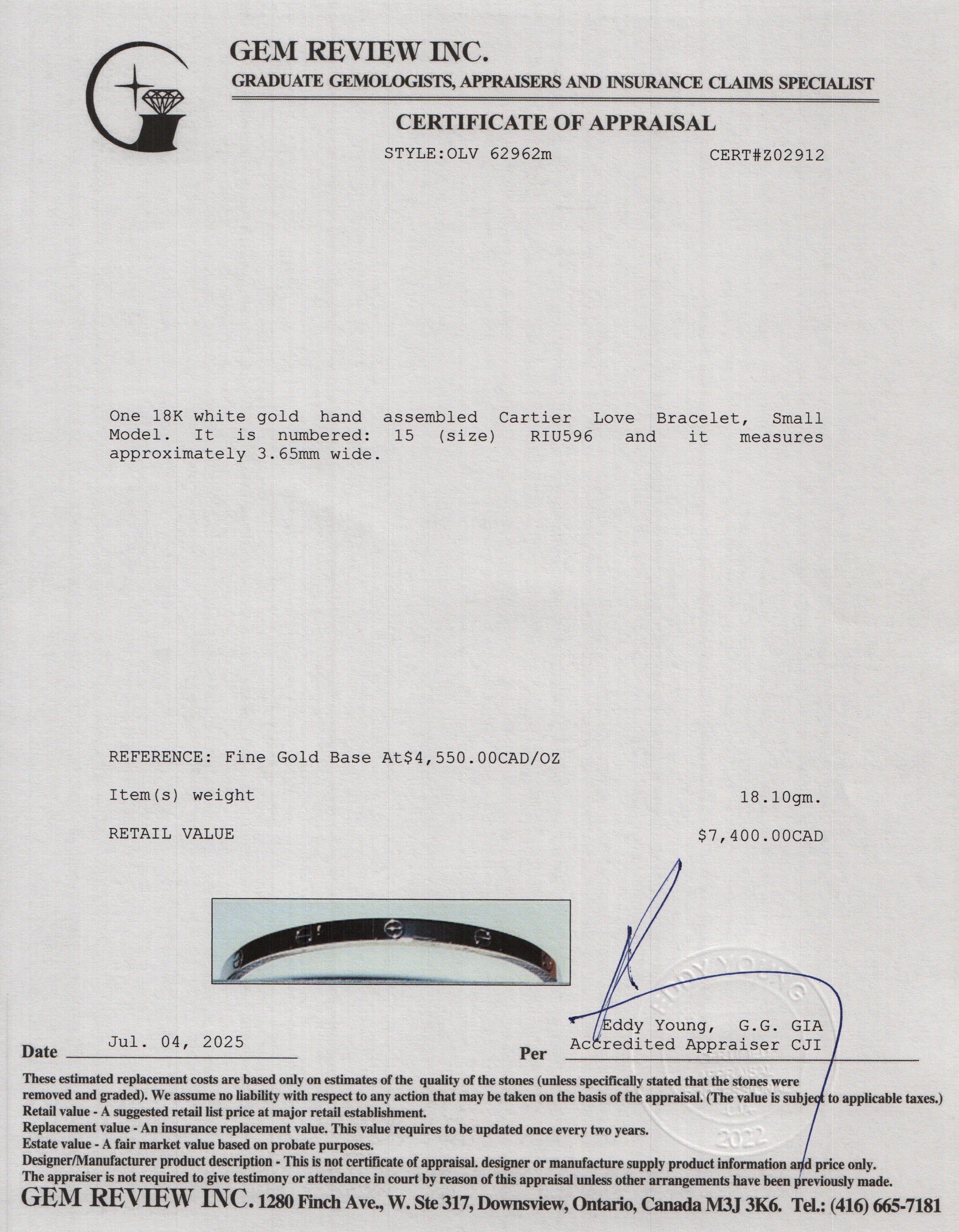 18k White Gold 3.65 MM Love Bracelet, Small Model, Size 15 w/ Certificate & Receipt