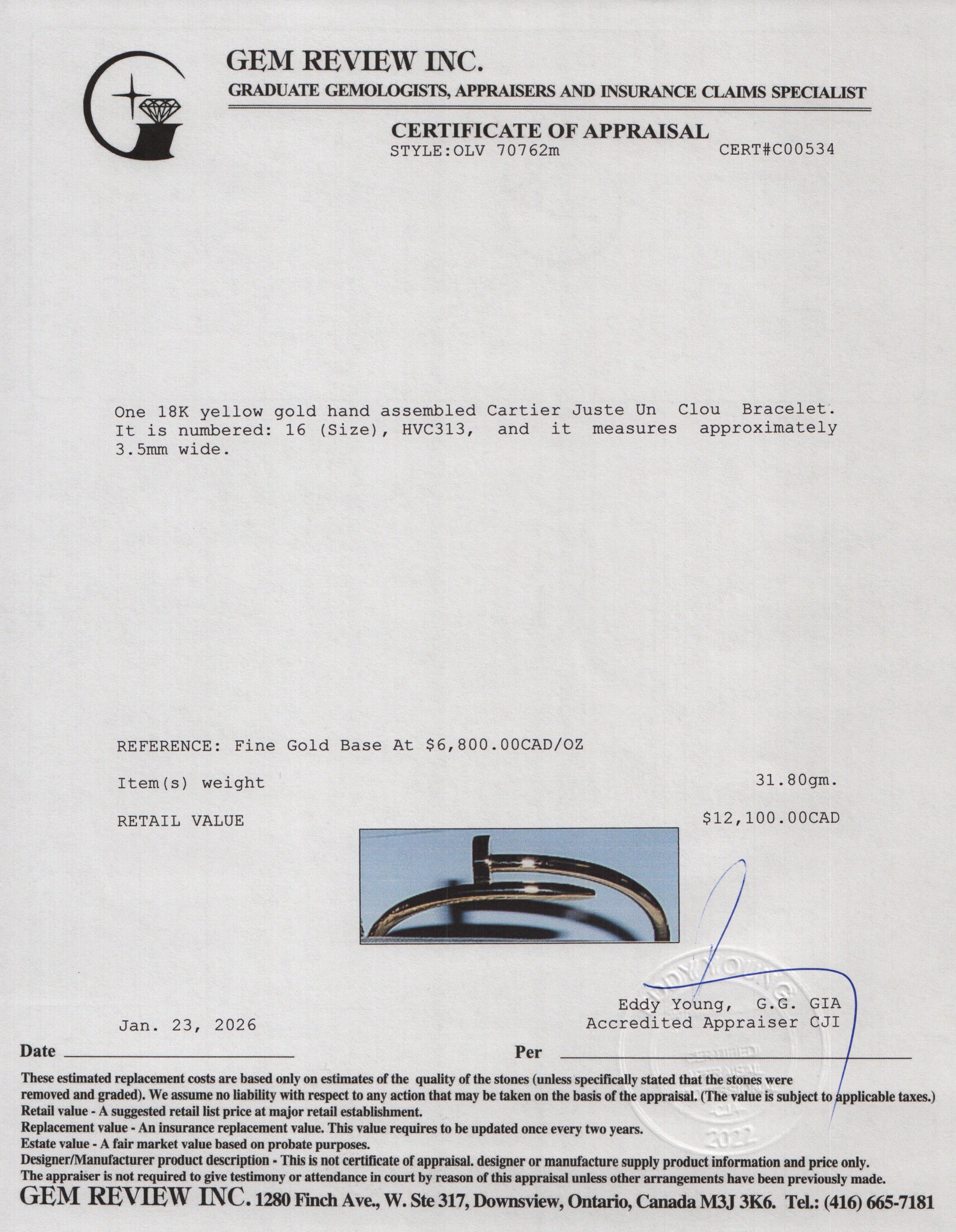 18k Yellow Gold Juste Un Clou Bracelet, Classic Model Size 16 w/ Box