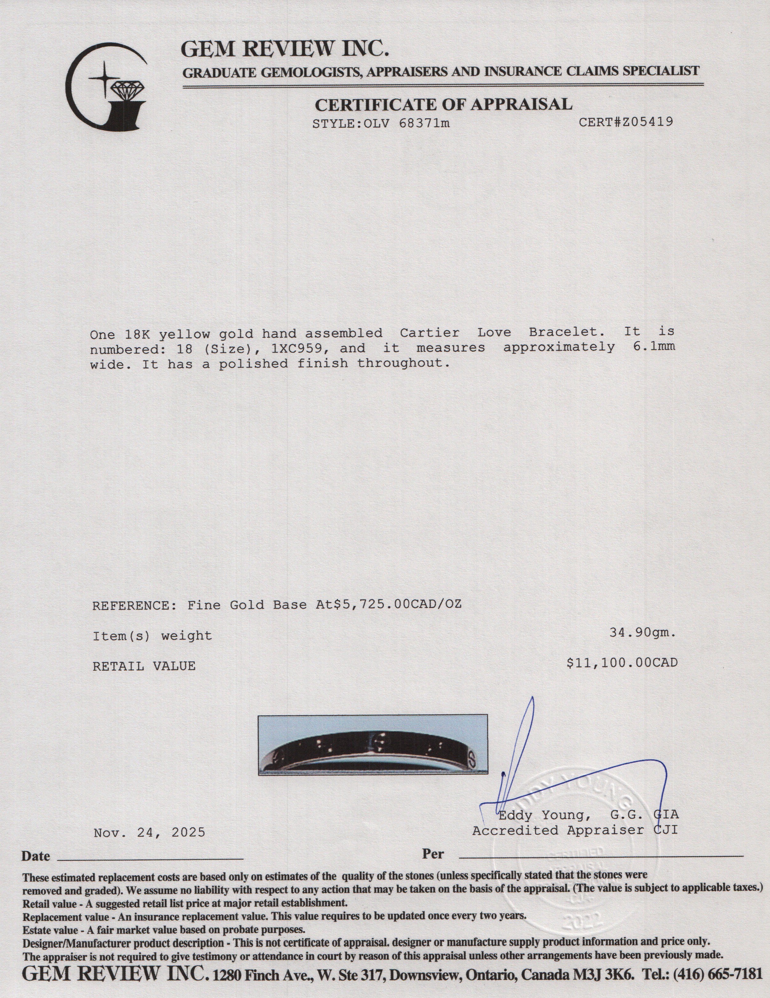 2020 18k Yellow Gold Love Bracelet, Classic Model, Size 18 w/ Box & Certificate