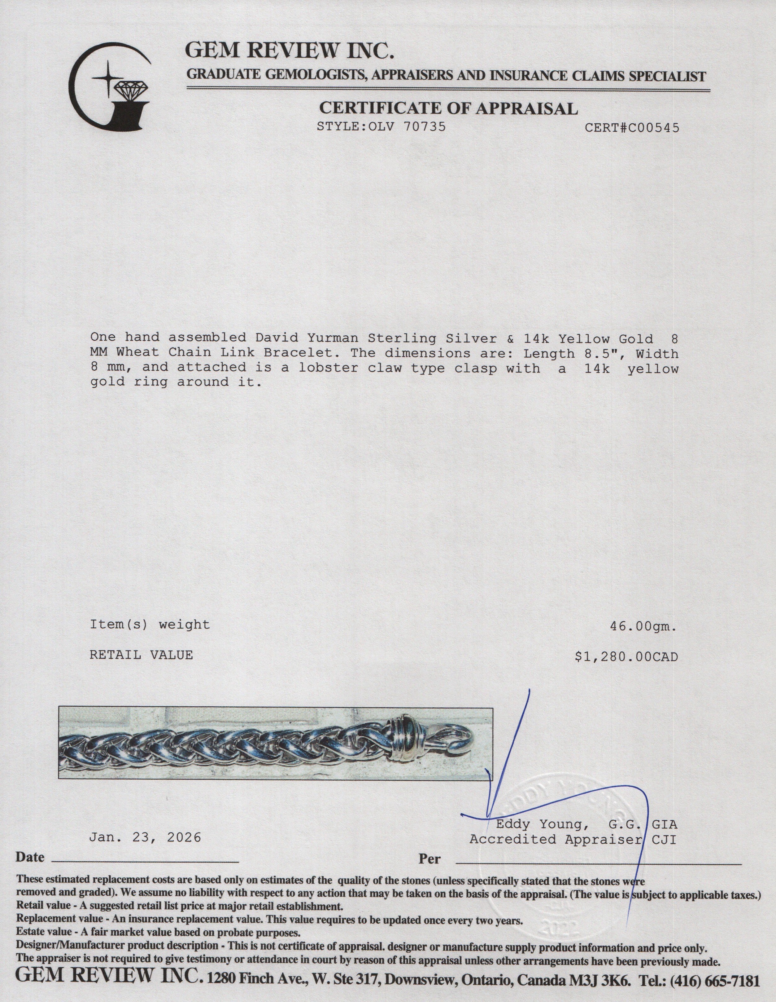 Sterling Silver & 14k Yellow Gold 8 MM Wheat Chain Link Bracelet