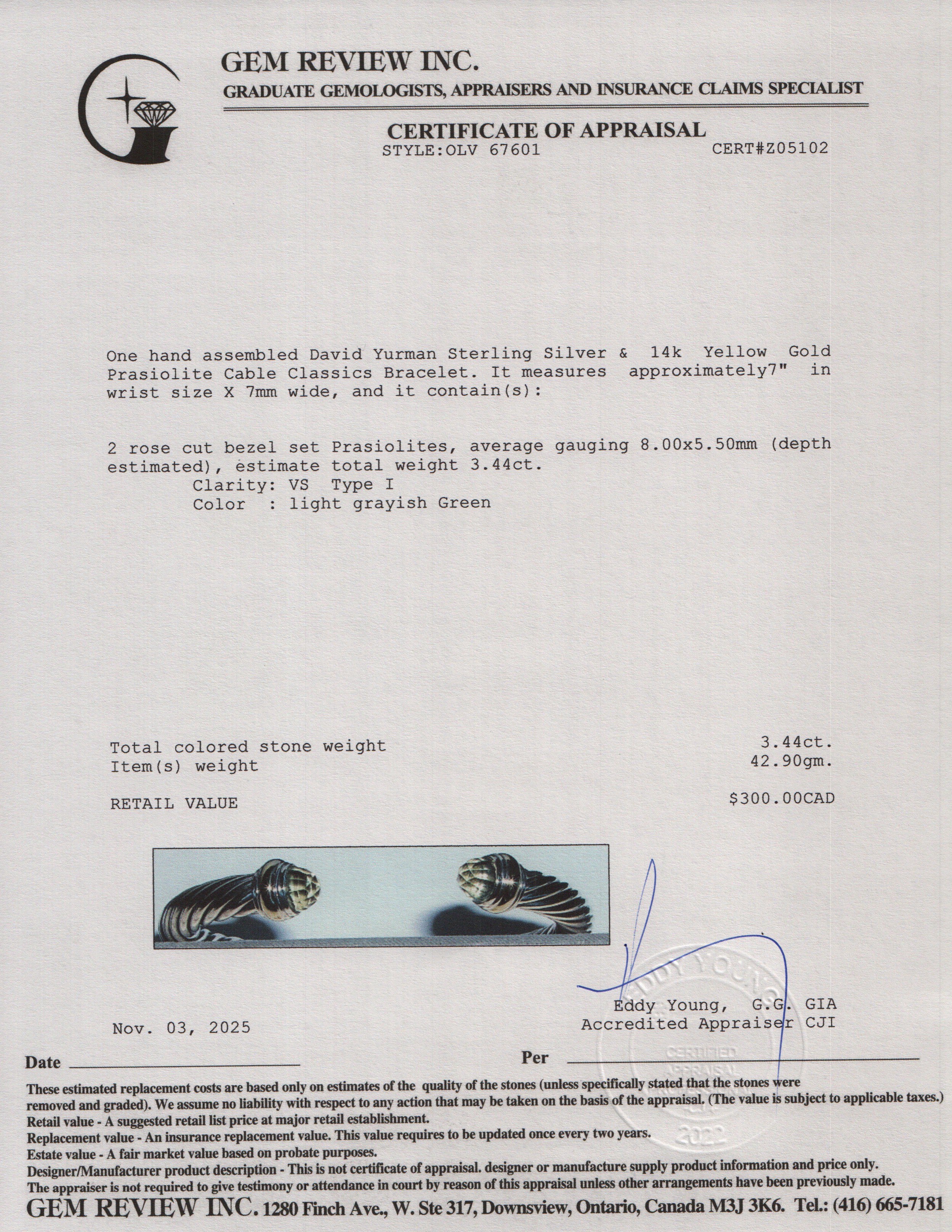 Sterling Silver & 14k Yellow Gold Prasiolite 7 MM Cable Classics Bracelet