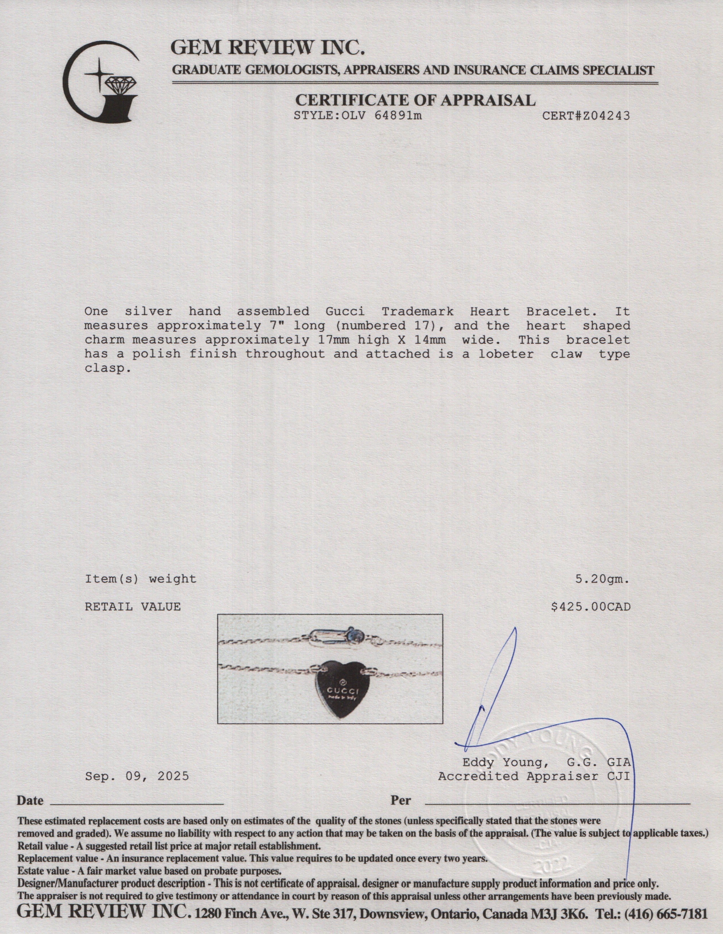 Sterling Silver Trademark Heart Bracelet, Size 17 w/ Box