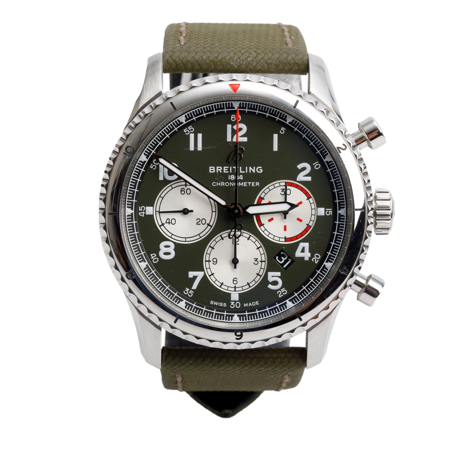 Stainless Steel Navitimer Aviator 8 Curtiss Warhawk 43 MM Automatic Chronograph Watch Green Dial AB0119 w/ Box & Papers