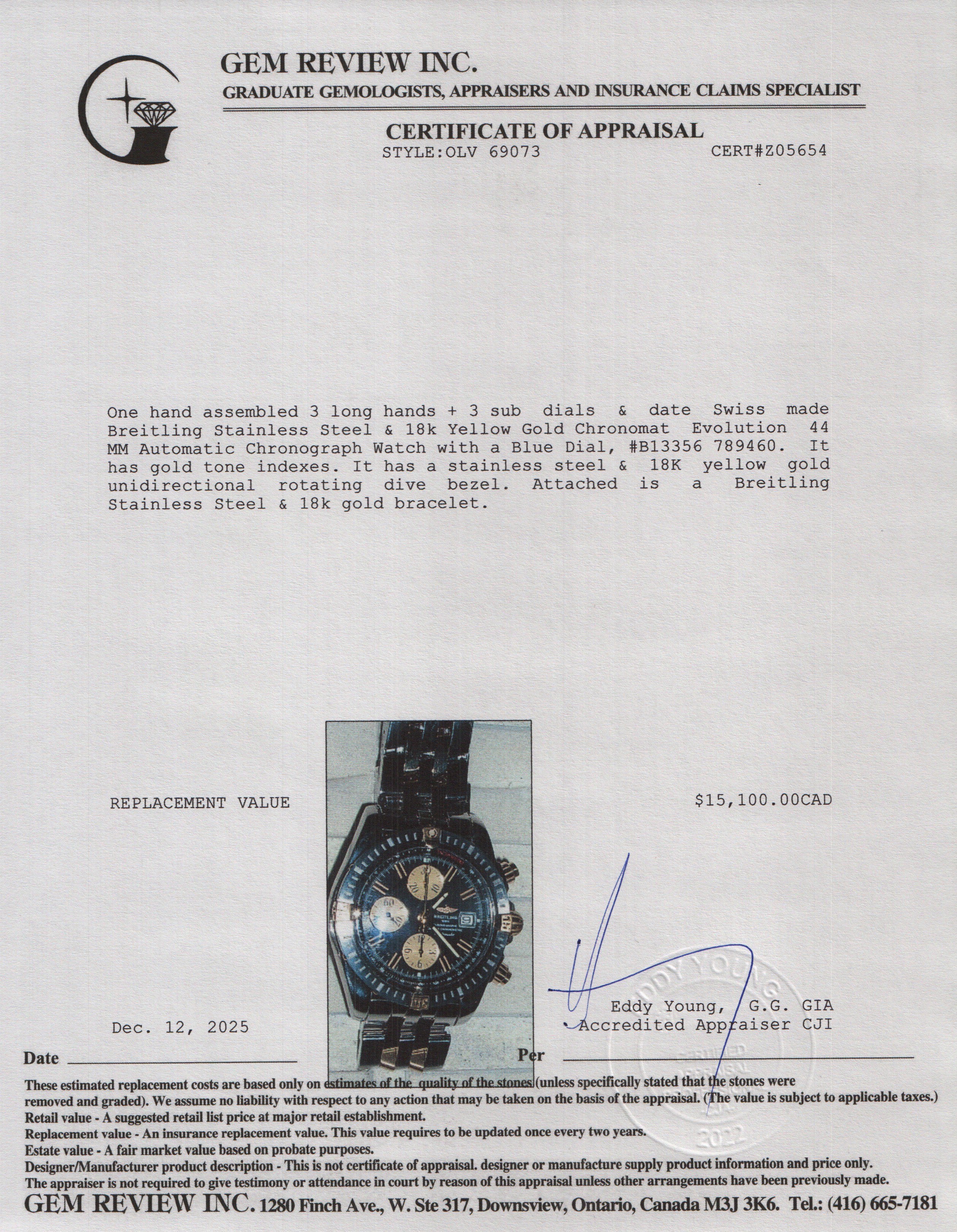 Stainless Steel & 18k Yellow Gold Chronomat Evolution 44 MM Automatic Chronograph Watch Blue Dial B13356 w/ Box & Papers