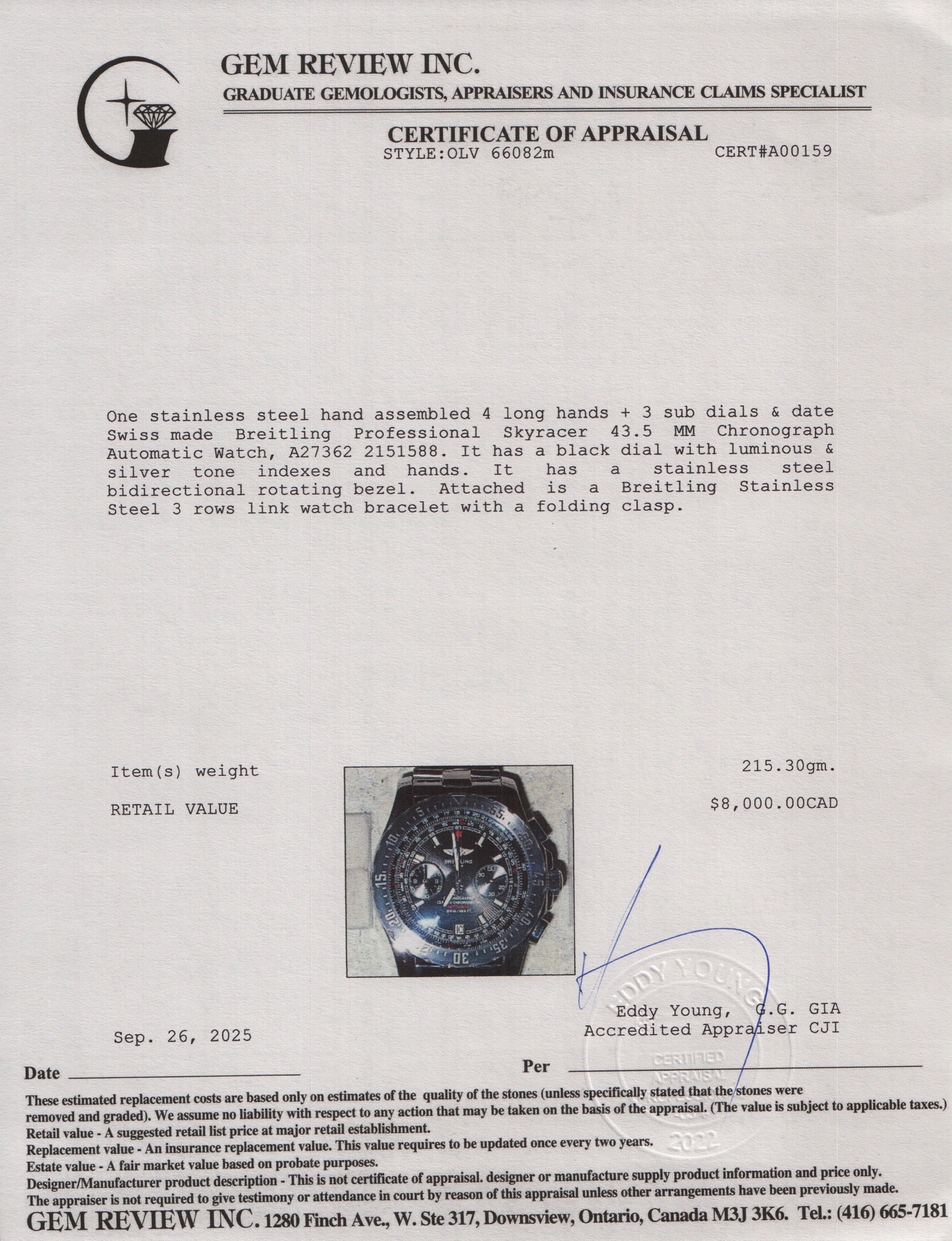 Stainless Steel Professional Skyracer 43.5 MM Chronograph Automatic Watch Black Dial A27362 w/ Box & Papers