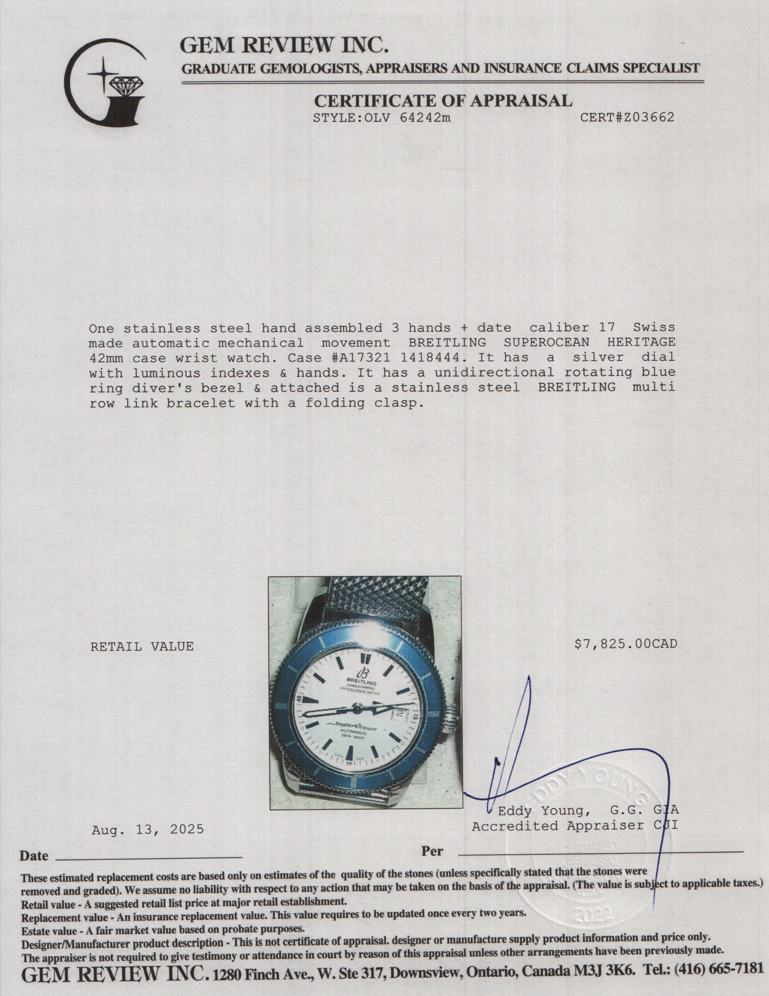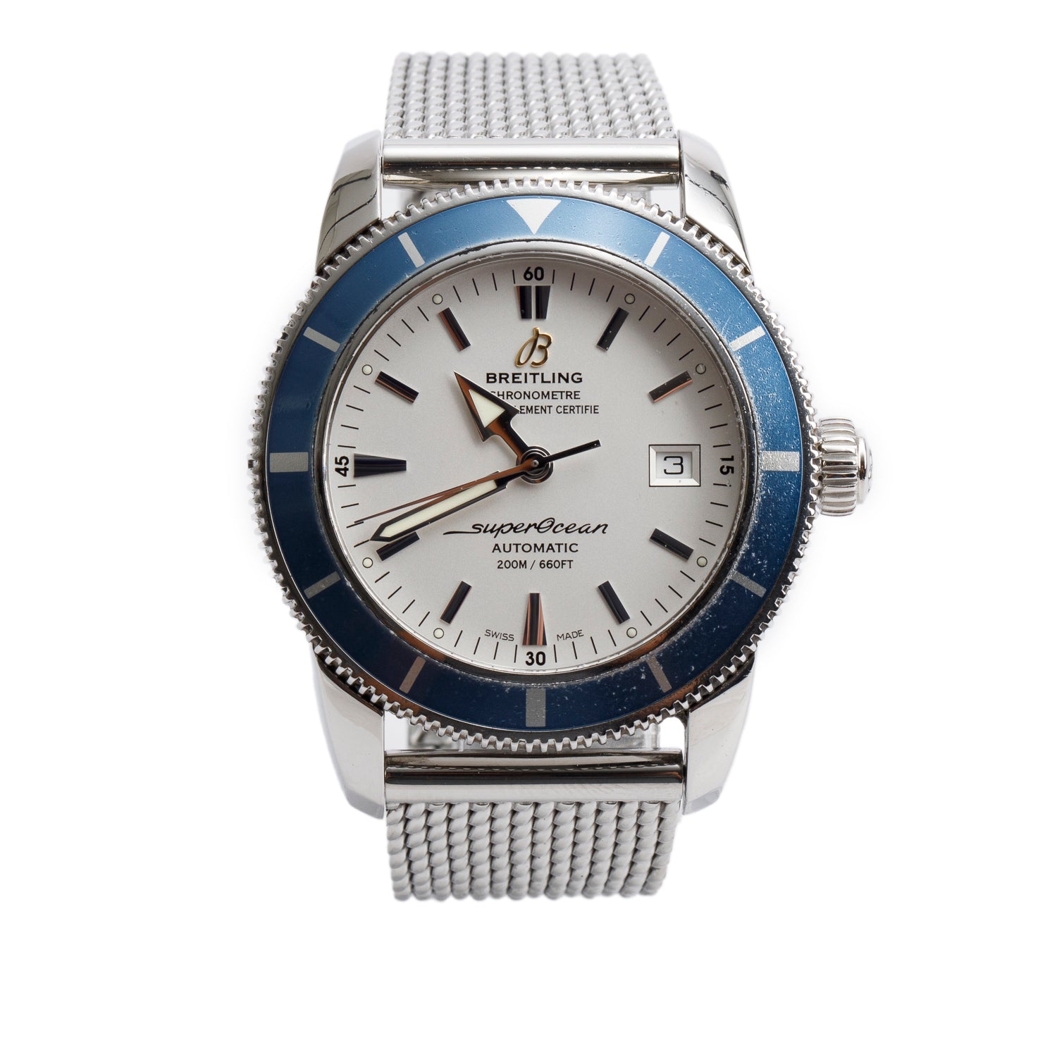 Stainless Steel Superocean Heritage 42 MM Automatic Watch Blue Bezel Silver Dial A17321 w/ Box, Papers & Extra Strap