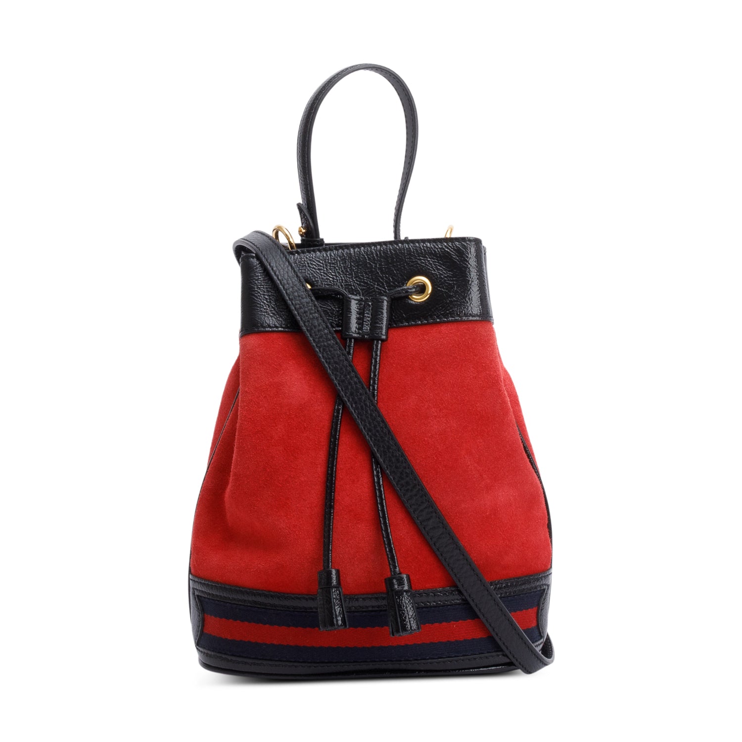 Red Suede Black Patent Leather Web Ophidia Small Bucket Bag