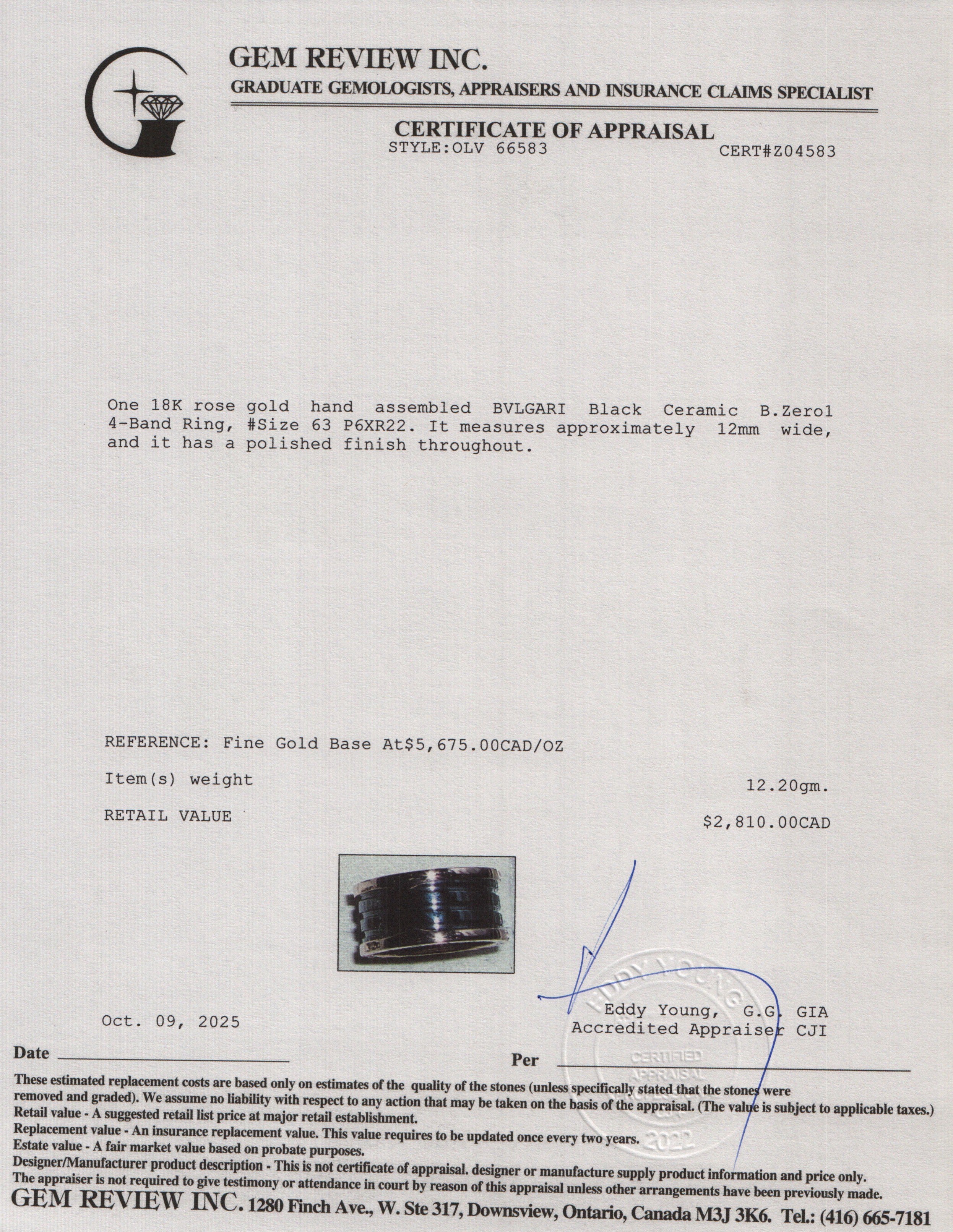 BVLGARI 18k Rose Gold & Black Ceramic B.Zero1 4-Band Ring, Size 63 10 w/ Box