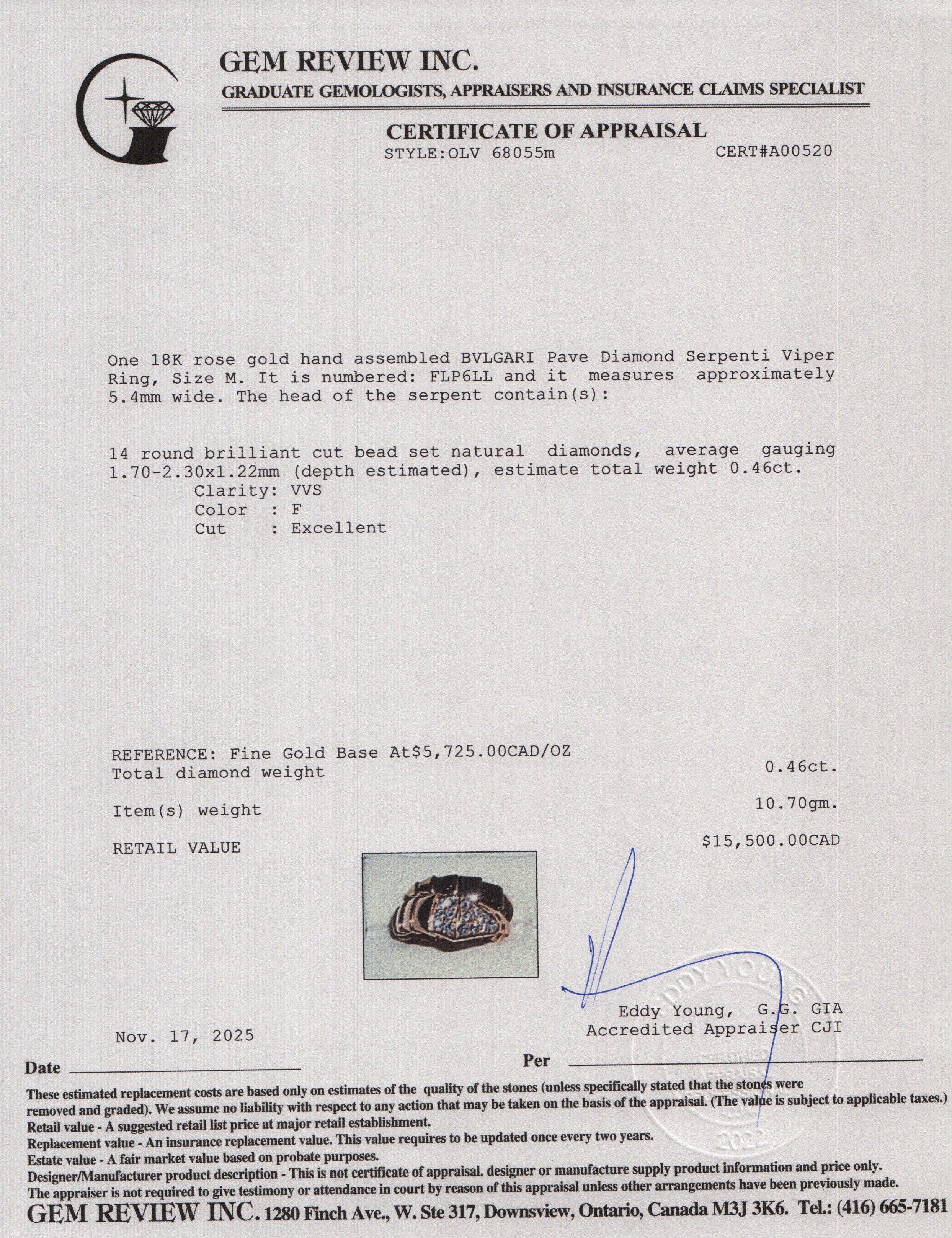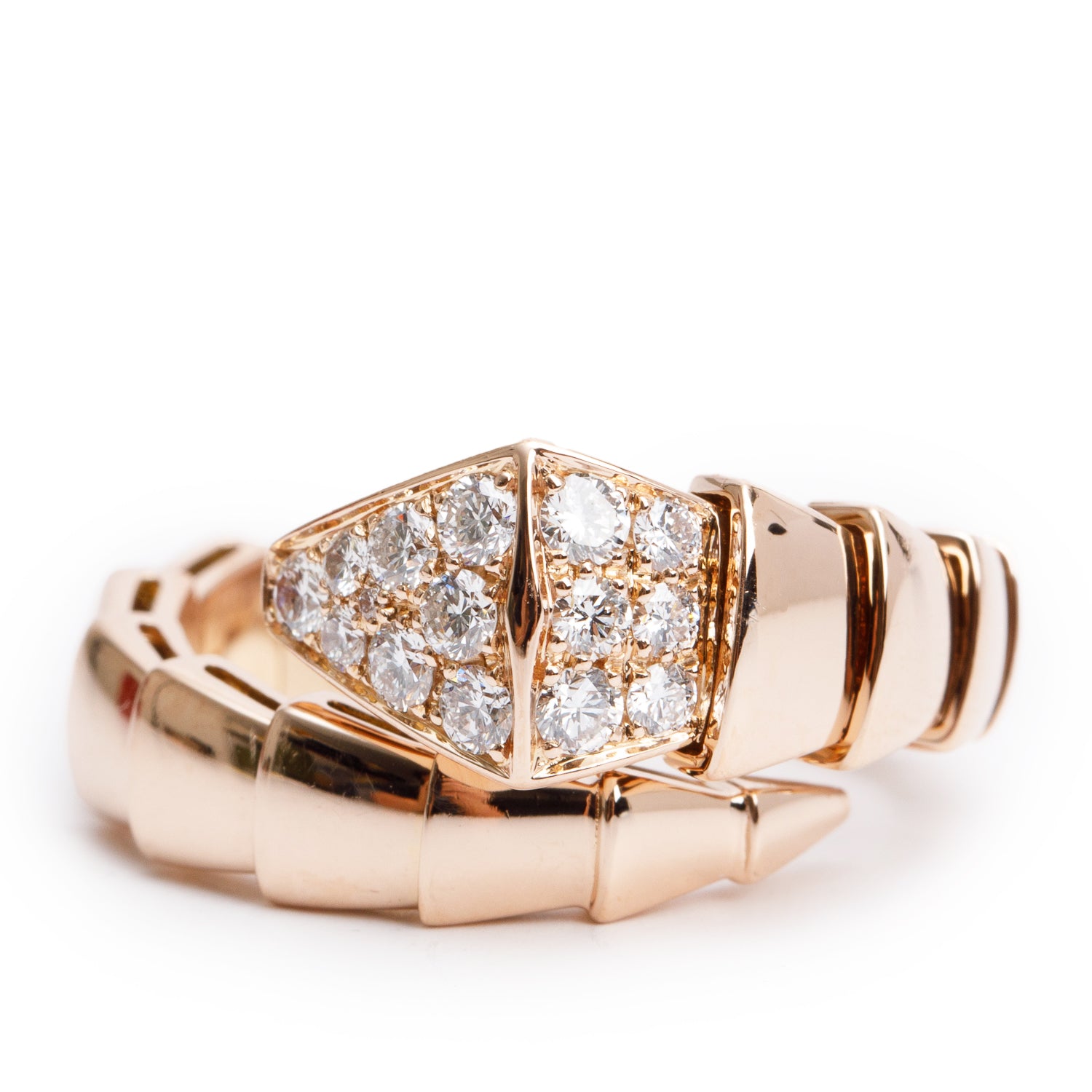 BVLGARI 18k Rose Gold Pave Diamond Serpenti Viper Ring, Size M w/ Box & Receipt