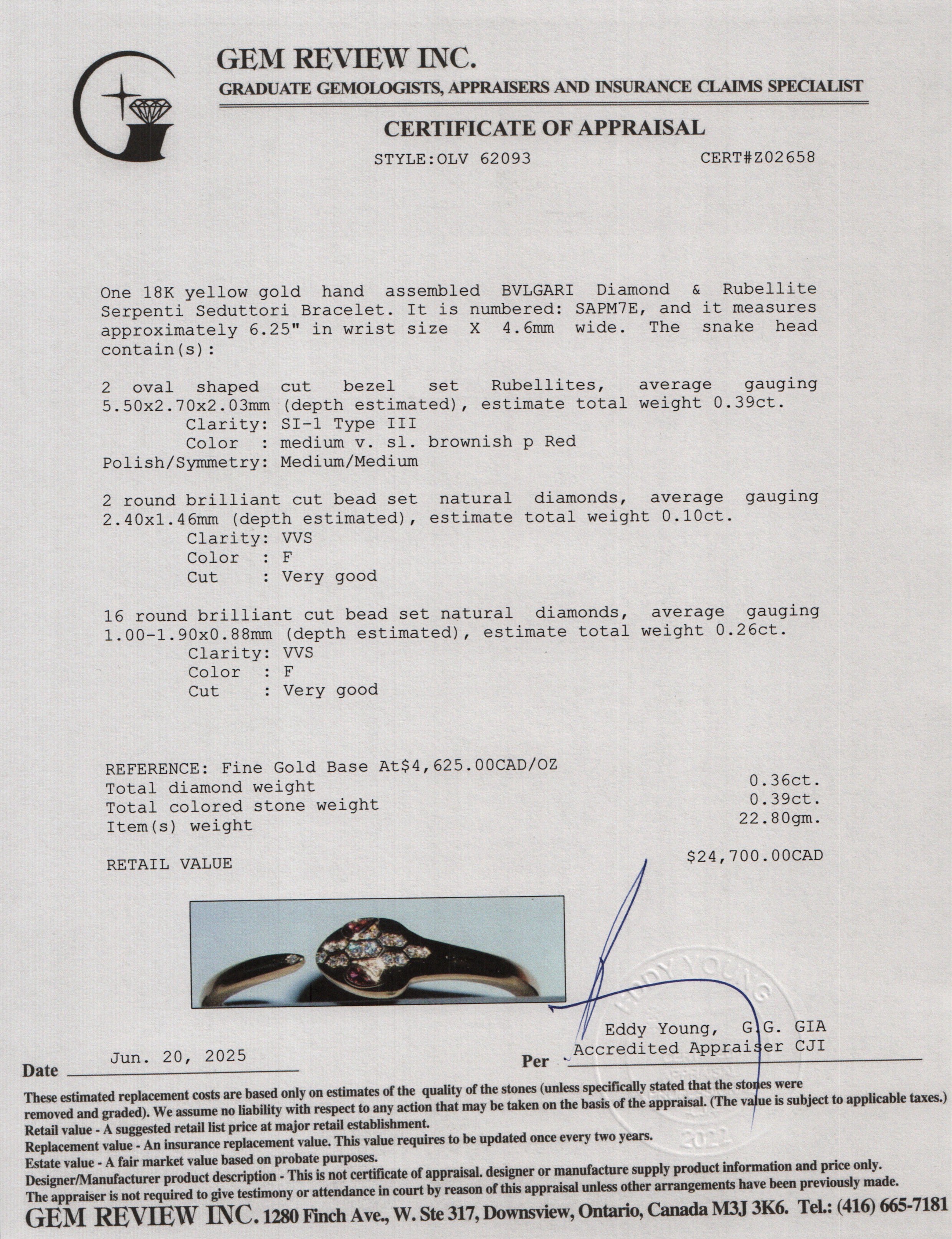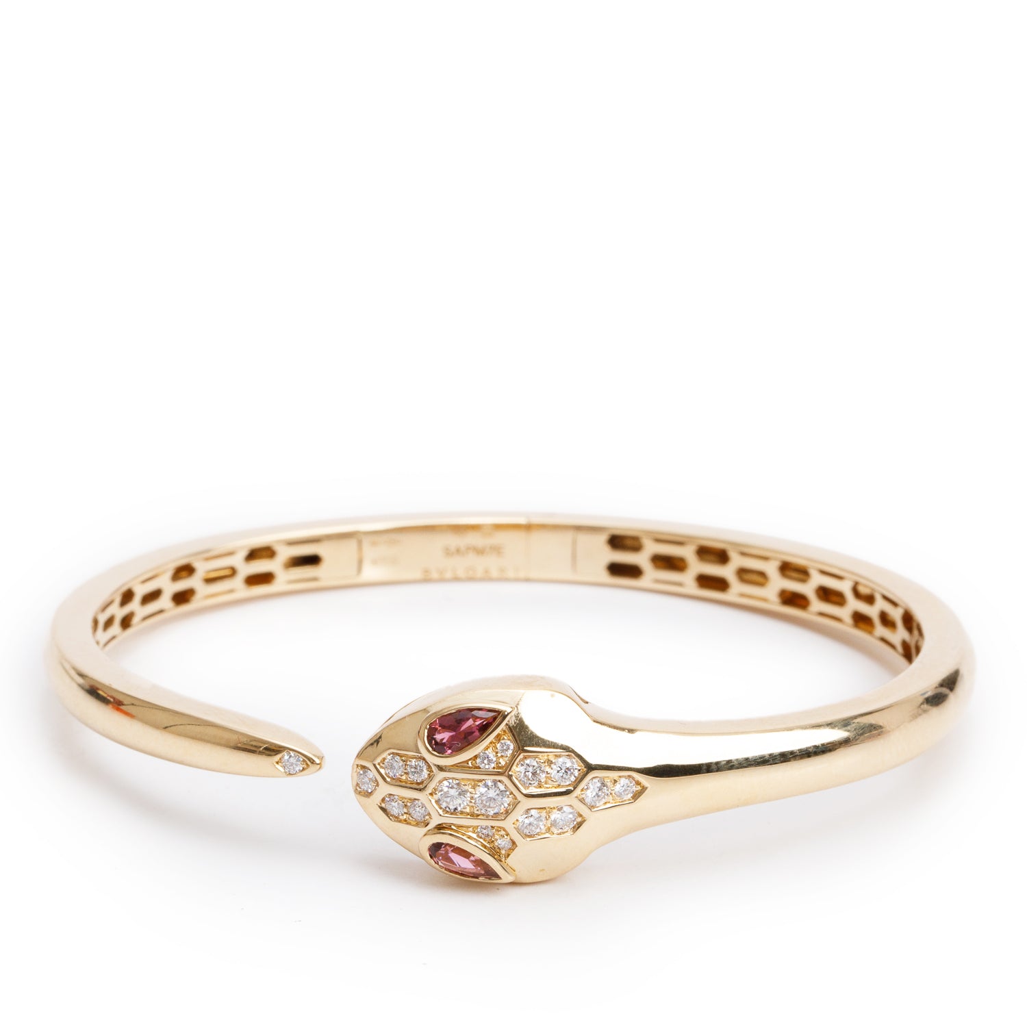 BVLGARI 18k Yellow Gold Diamond & Rubellite Serpenti Seduttori Bracelet, Size S w/ Box