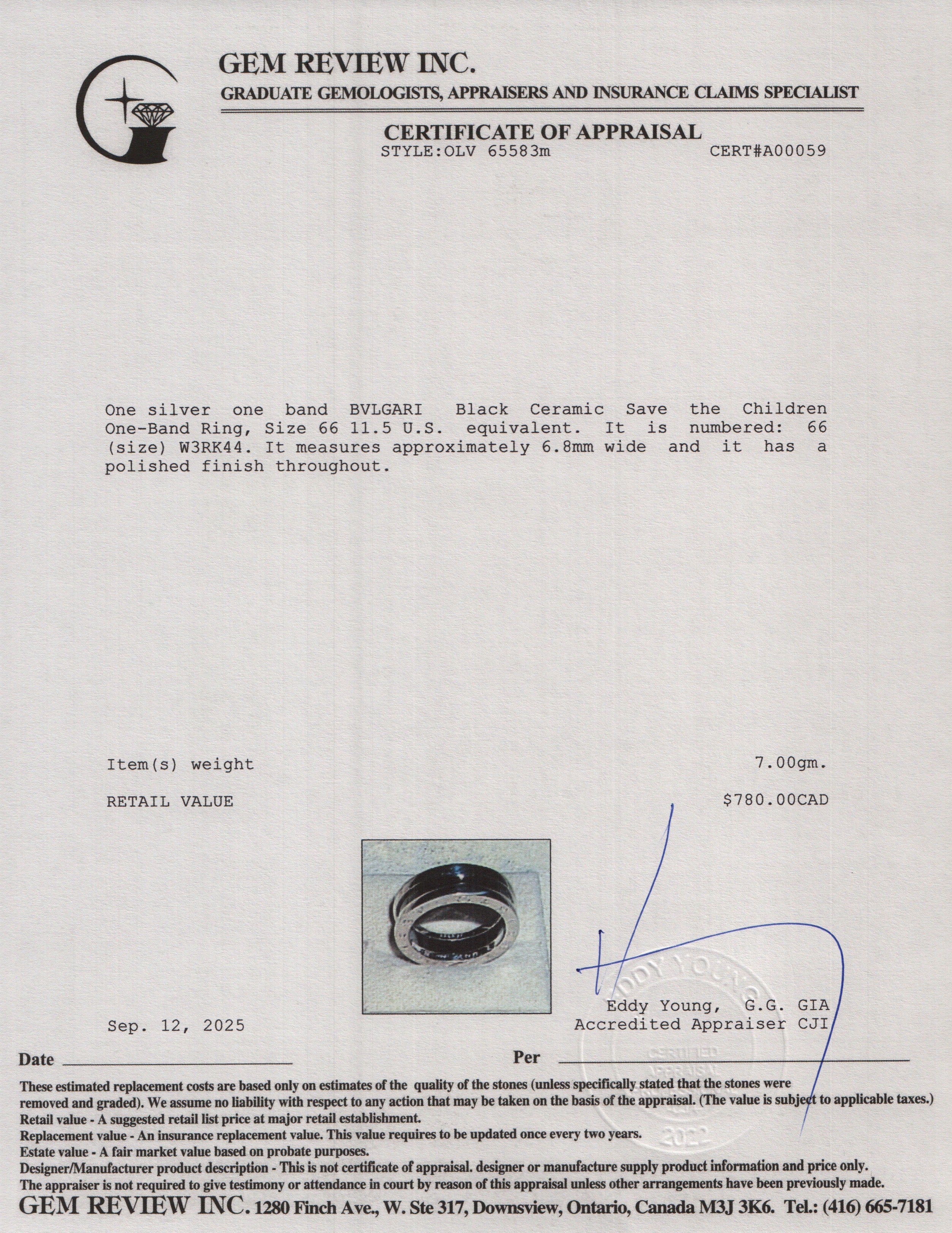 BVLGARI Sterling Silver Black Ceramic Save the Children One-Band Ring, Size 66 11.5 w/ Box