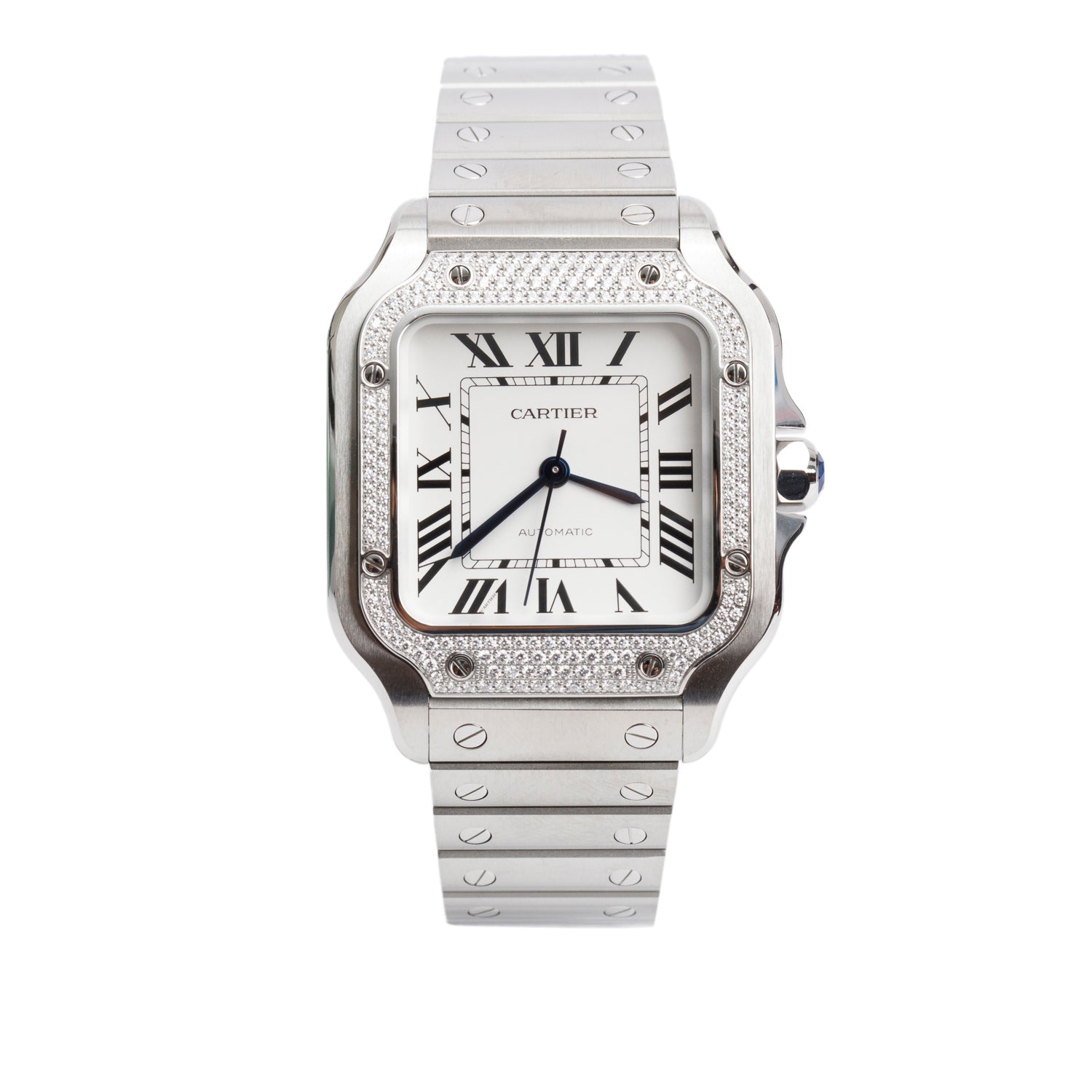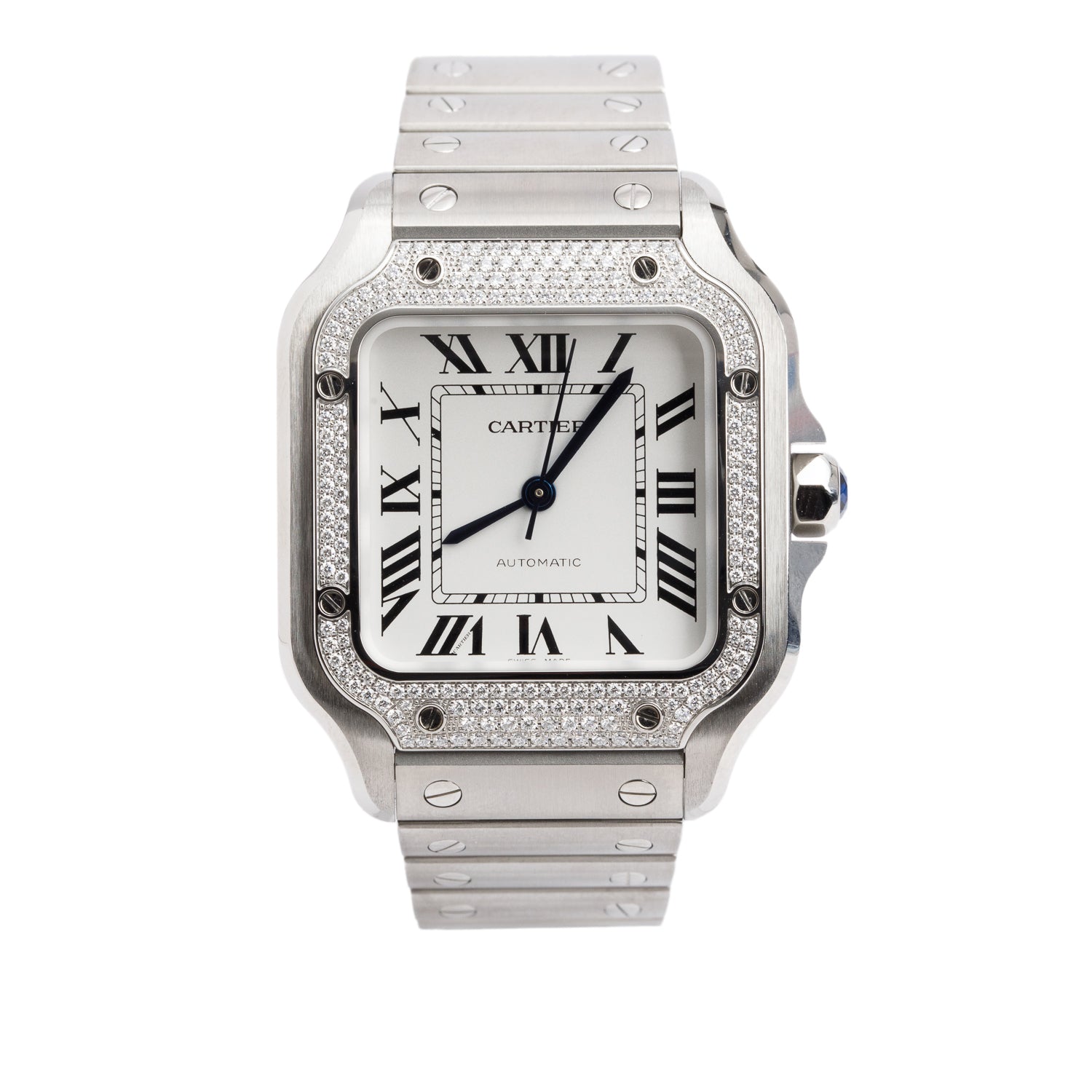 2023 Stainless Steel Diamond Bezel Santos de Automatic Watch, Medium Model 4075 w/ Box, Papers & Extra Leather Strap