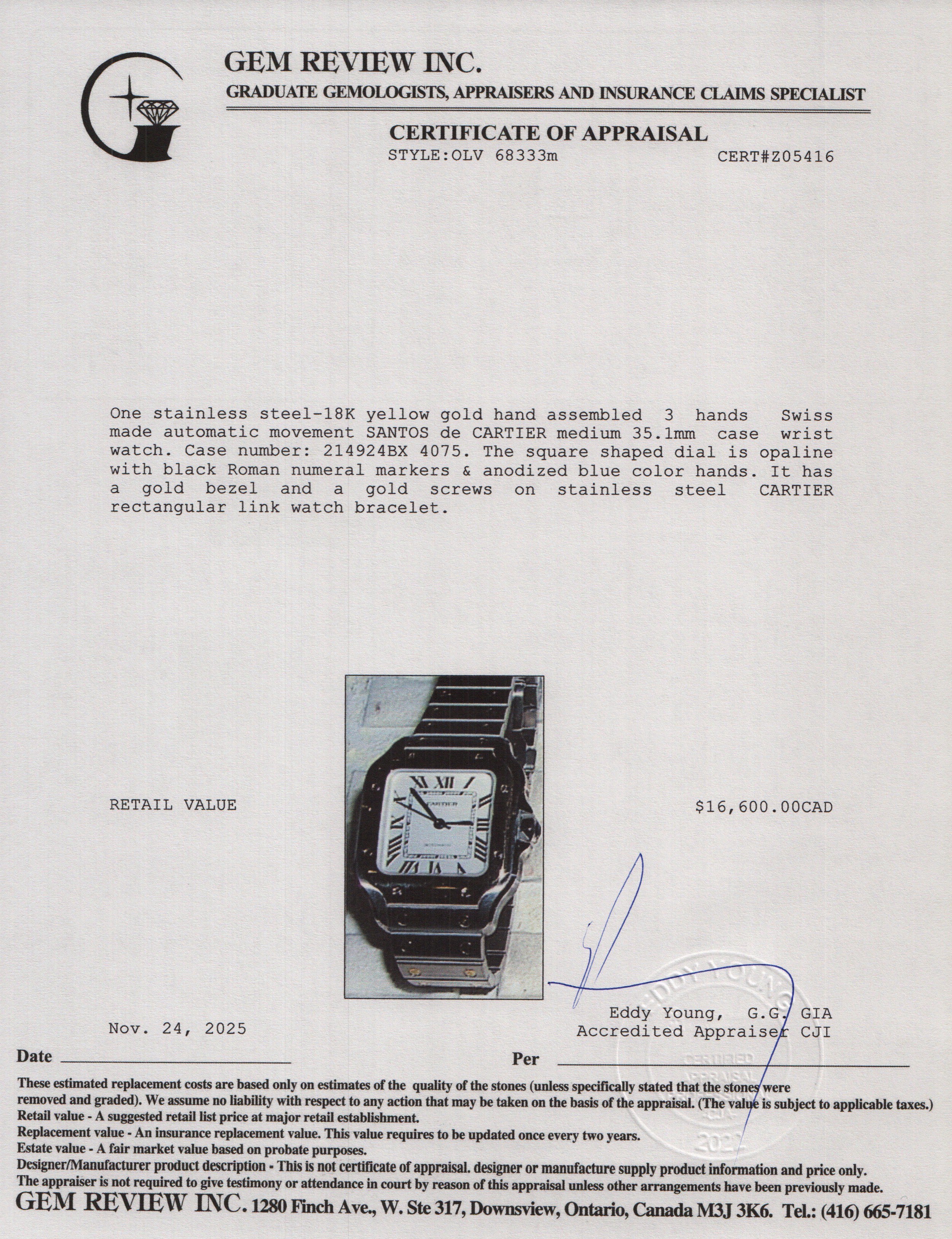 2021 Stainless Steel & 18k Yellow Gold Santos de Automatic Watch, Medium Model 4075 w/ Box, Papers & Extra Leather Strap